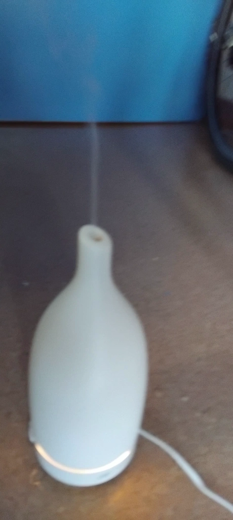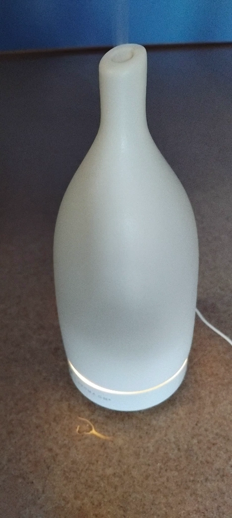 White essential oil diffuser with a ceramic base. It comes with a cord to plug into the wall. It does not include any essential oils.