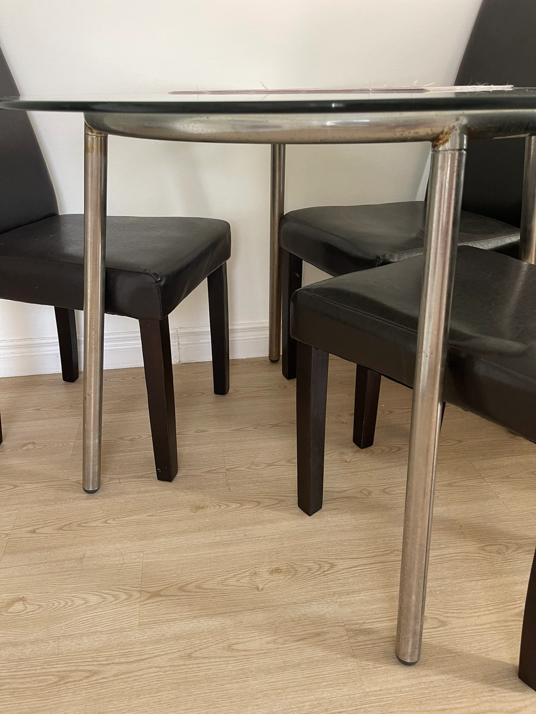 Round glass table with a silver metal base and three black faux leather chairs. It’s used, the glass is just sitting on it and is a bit rusted and can use some TLC.