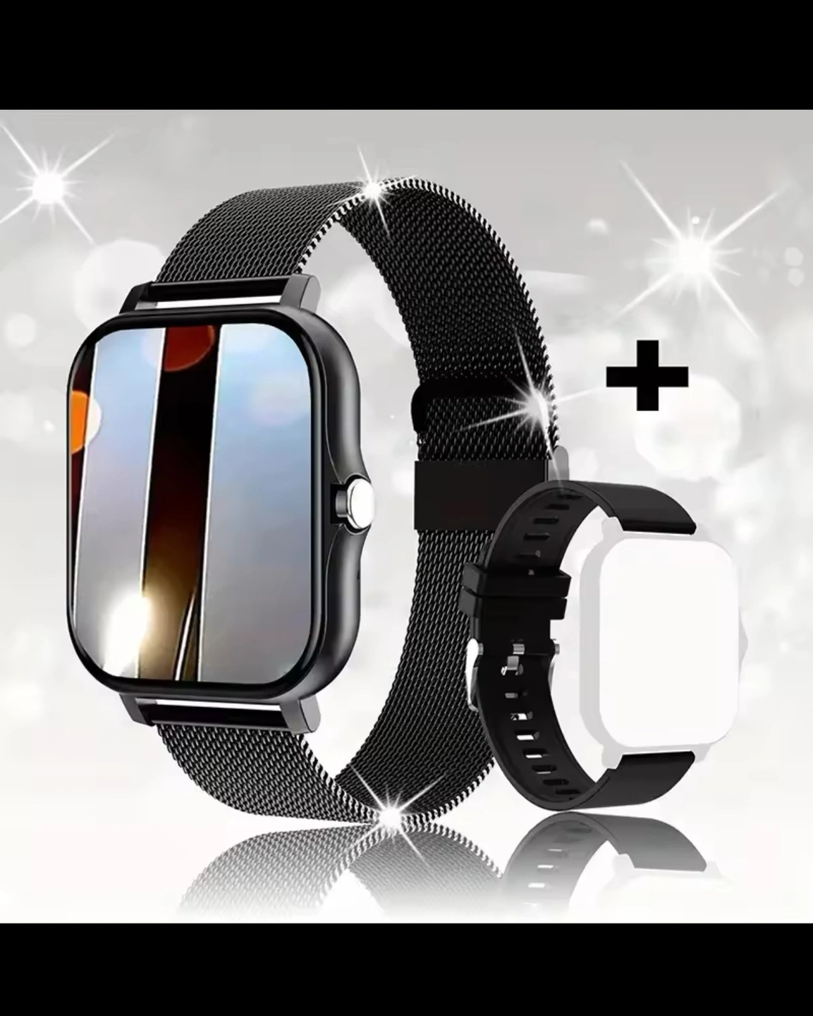 Smart watch with two bands, one metal and one silicone.
