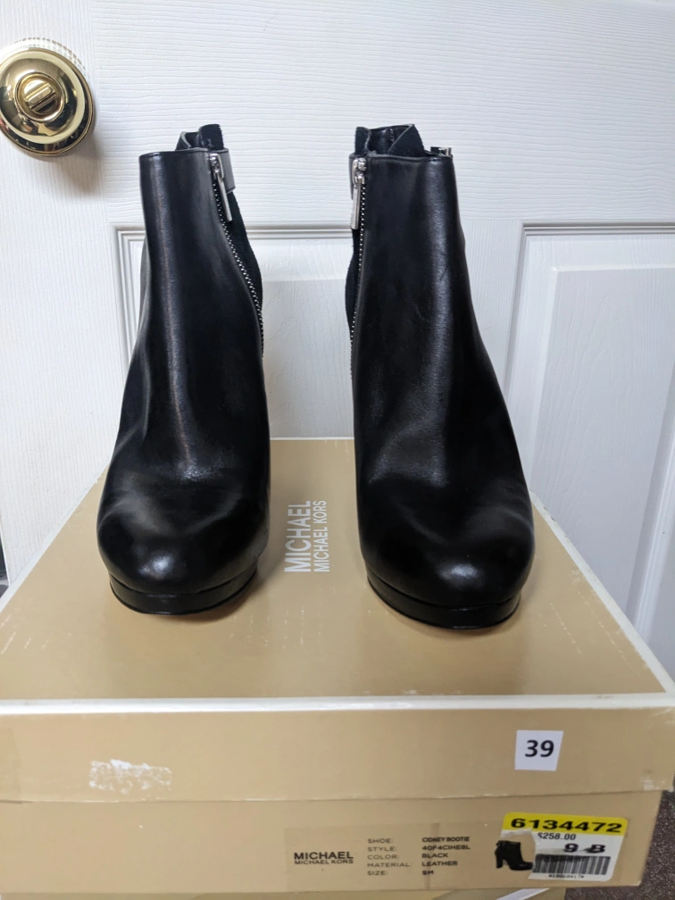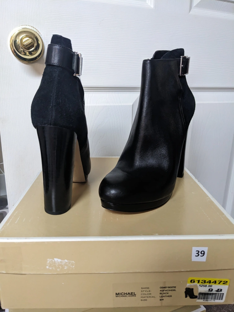 Black leather ankle boots with a chunky heel and buckle detail. Size 9. Comes in original box.