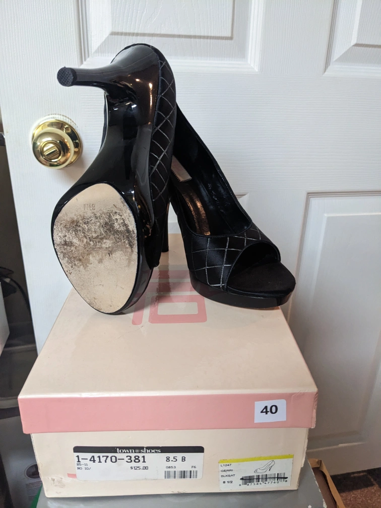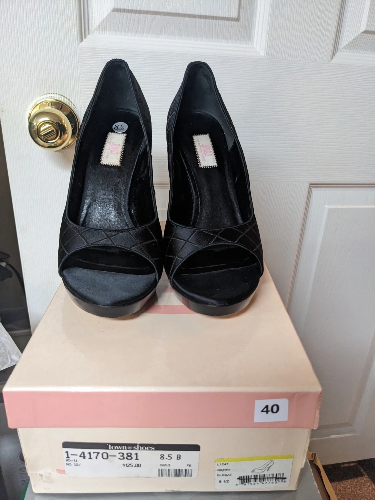 These are stylish and comfortable heels with a black quilted fabric and a peep toe. They are a great choice for a night out or a special occasion, size 8.5. comes with the original box.