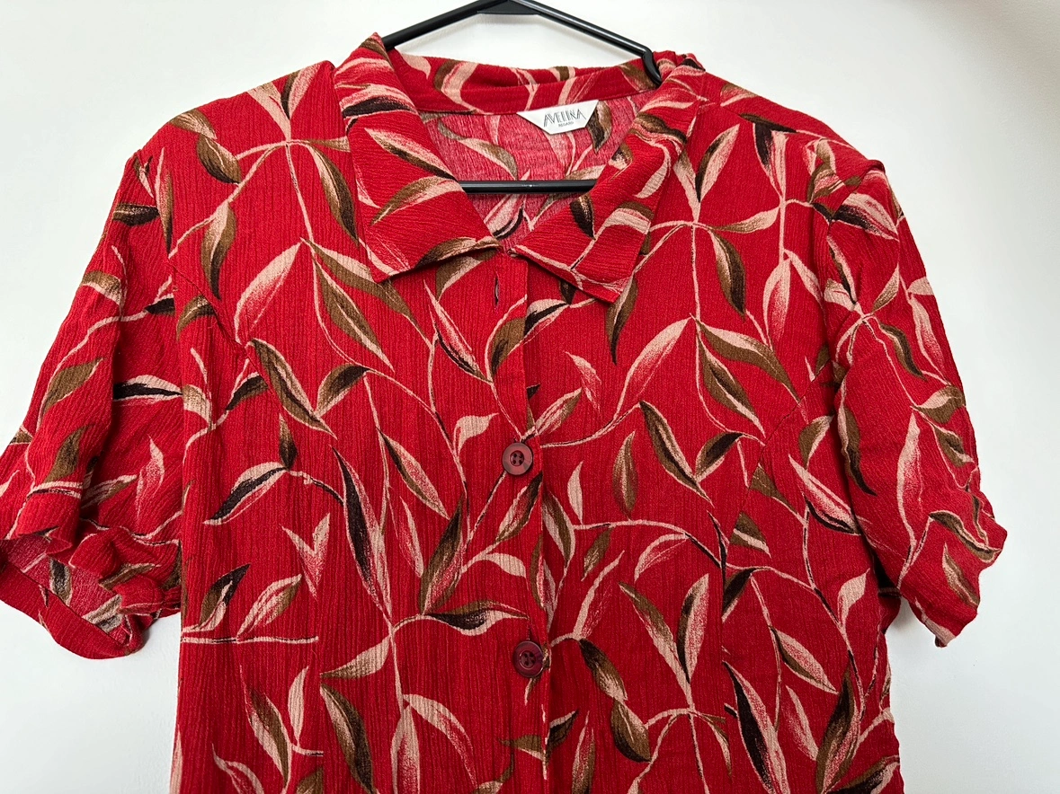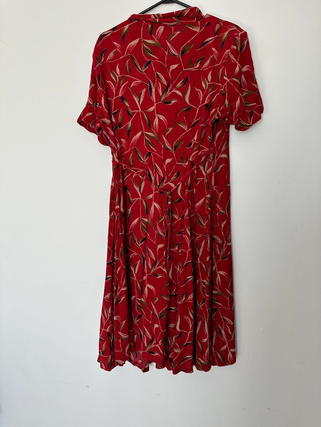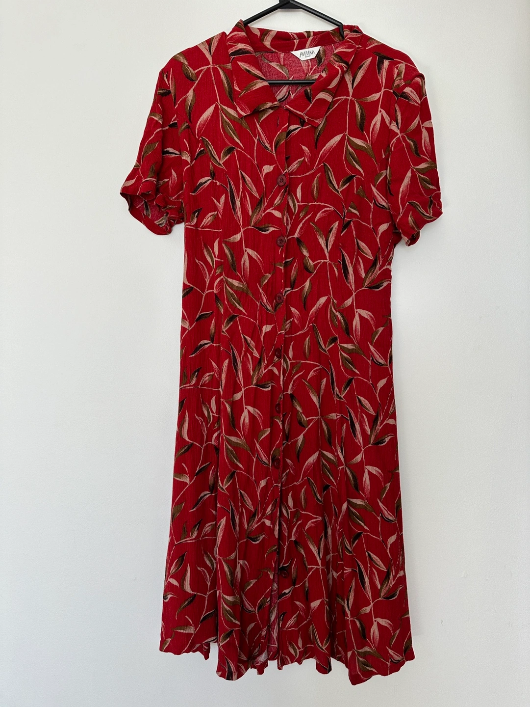 A red button-down dress with a floral pattern. It features a collared neckline and short sleeves. The dress is fitted at the waist and flows out to a flared skirt. It is perfect for a summer day.