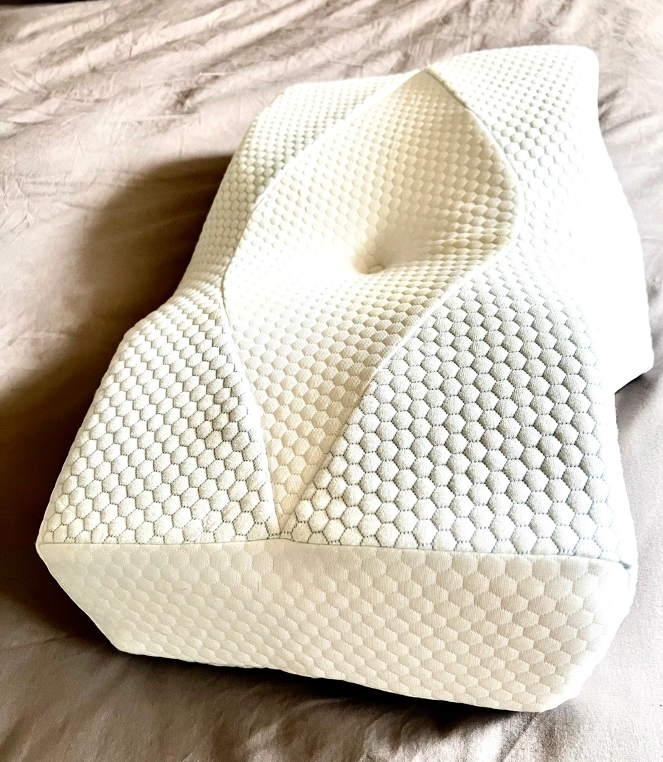 This pillow is designed to provide support for your neck and head. It is made from memory foam and has a contoured shape to help keep your spine aligned.