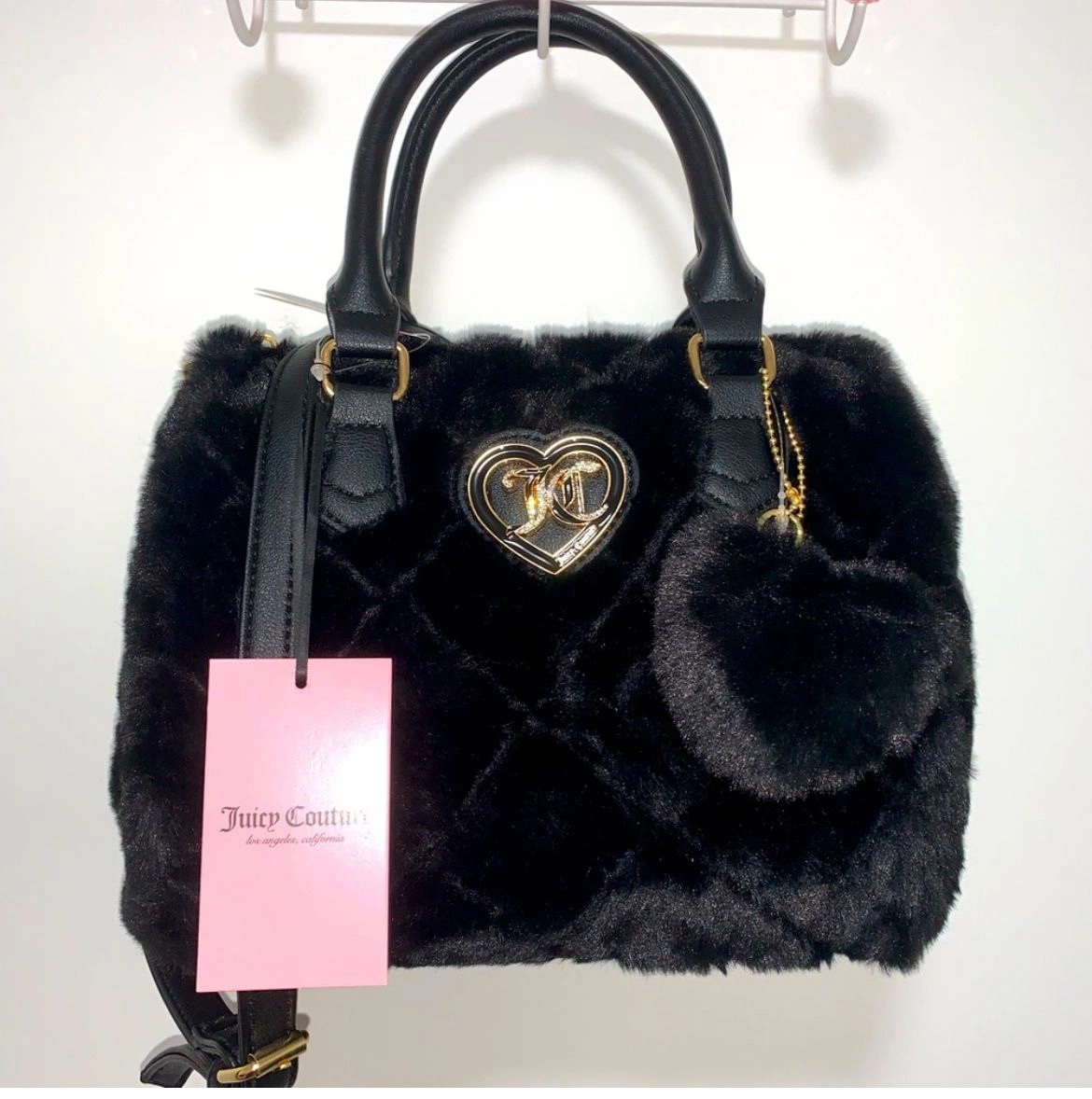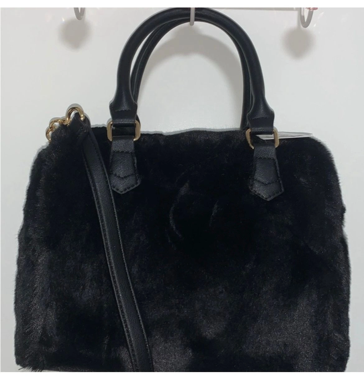 Black faux fur handbag with gold accents and a detachable shoulder strap. It also includes a cute pom-pom keychain.