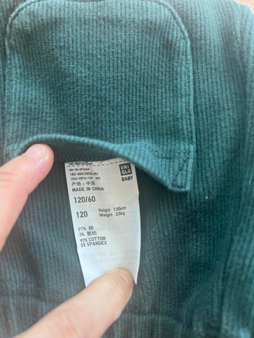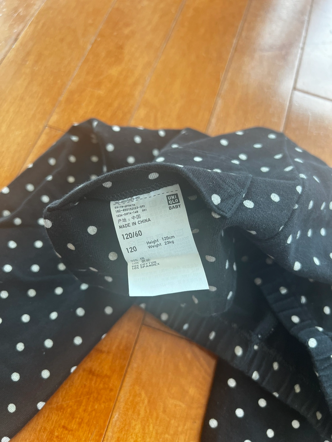 Three pairs of UNIQLO kids leggings in sizes 120/60, black with white dots, grey, and green. Pick up only.