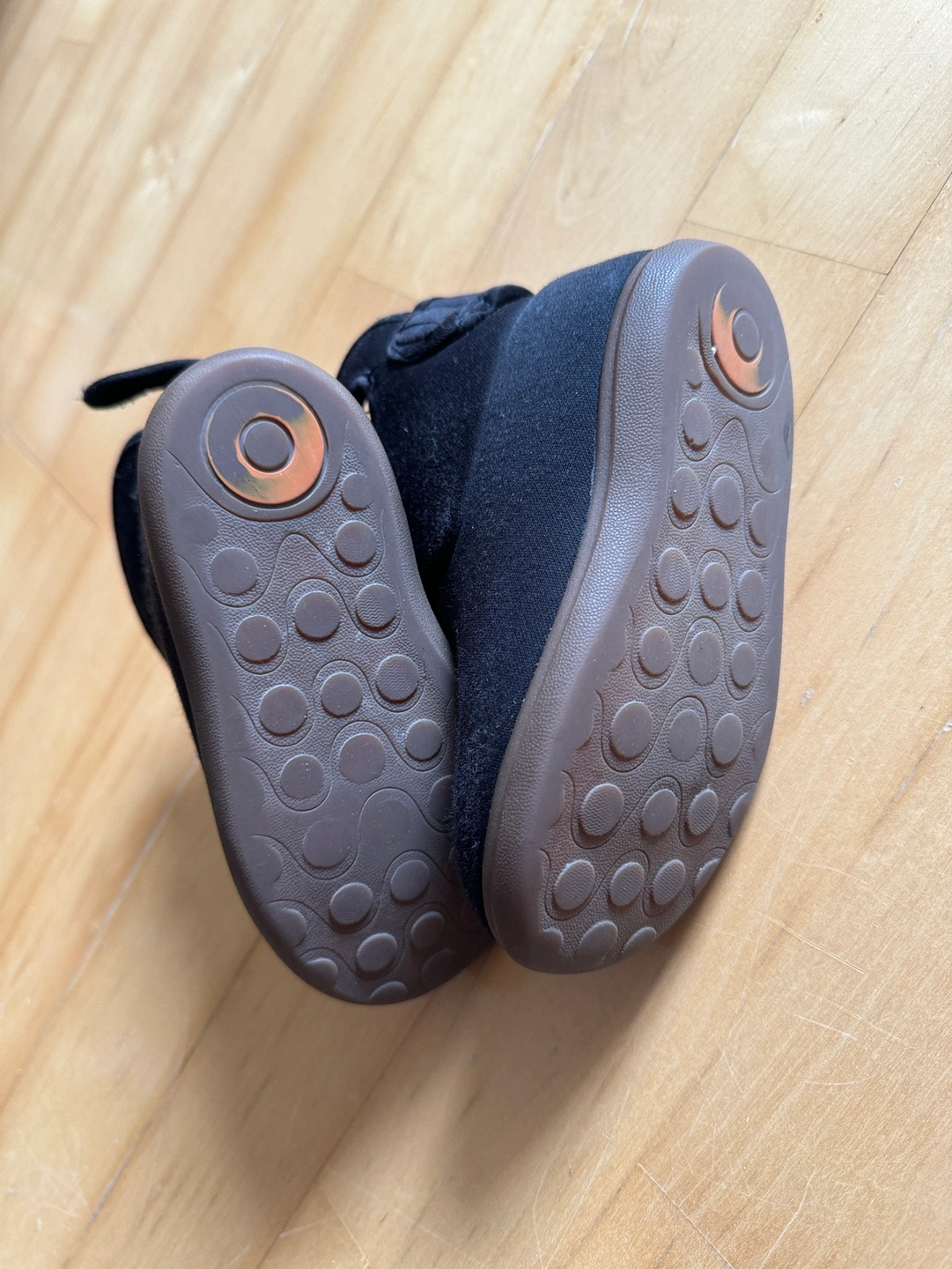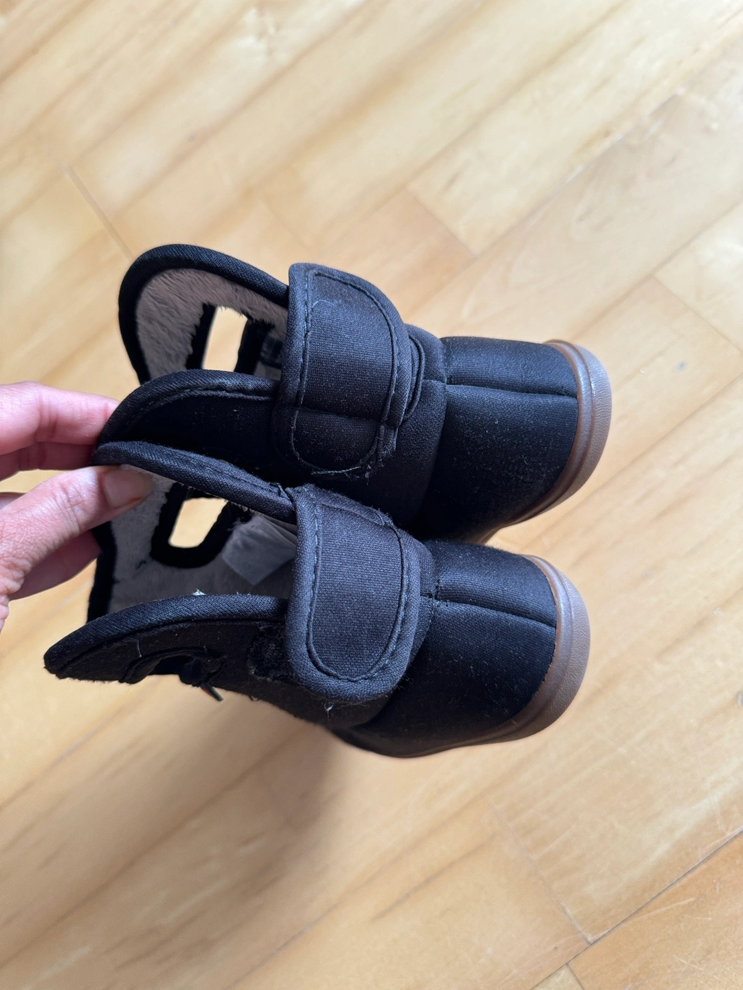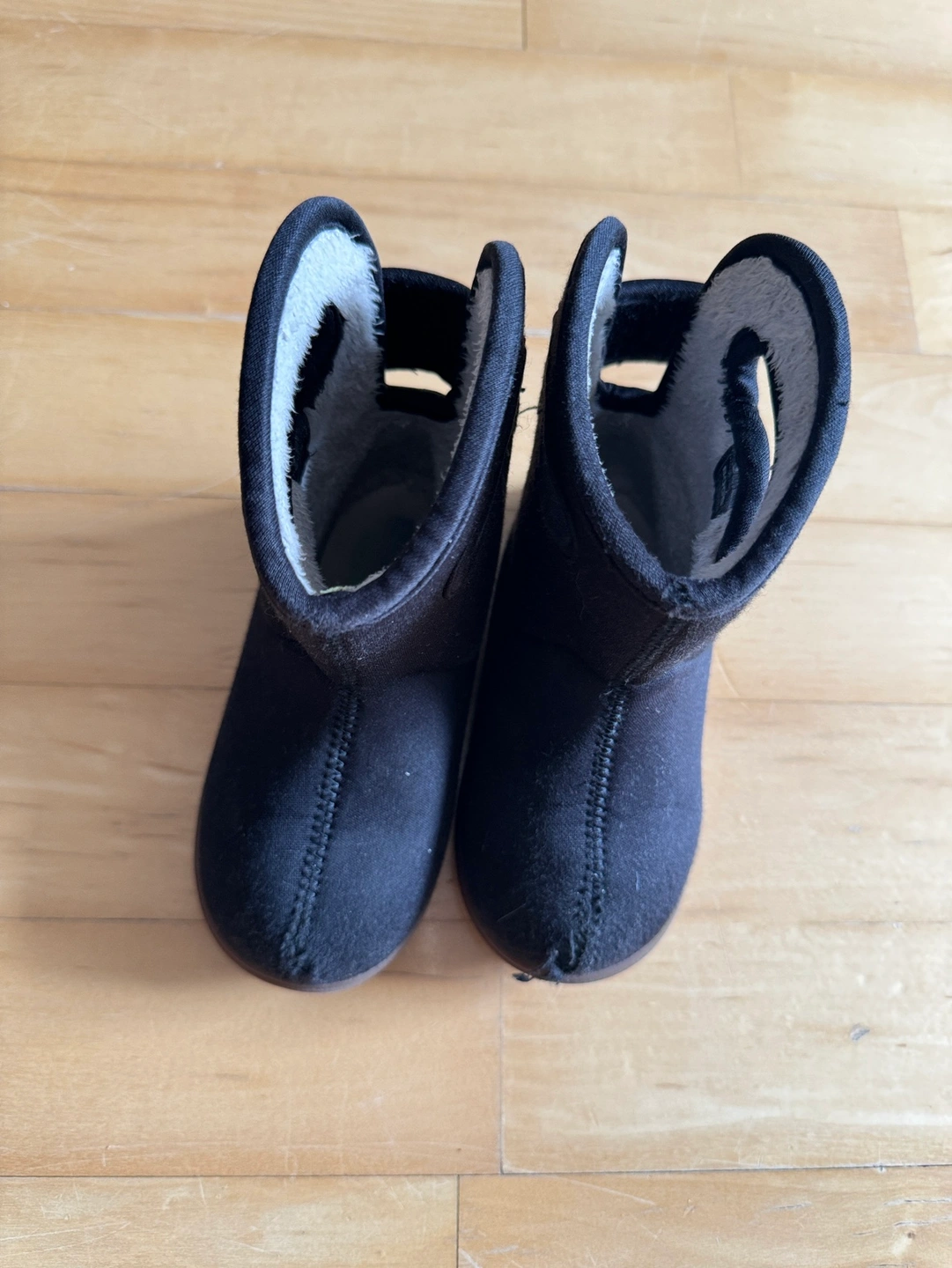 Black baby boots with brown soles and fleece lining. And waterproof.The boots are size 2. Good for age 2-3years old .They have Velcro straps for easy on and off. The boots have been gently worn. Best for snow and rain.