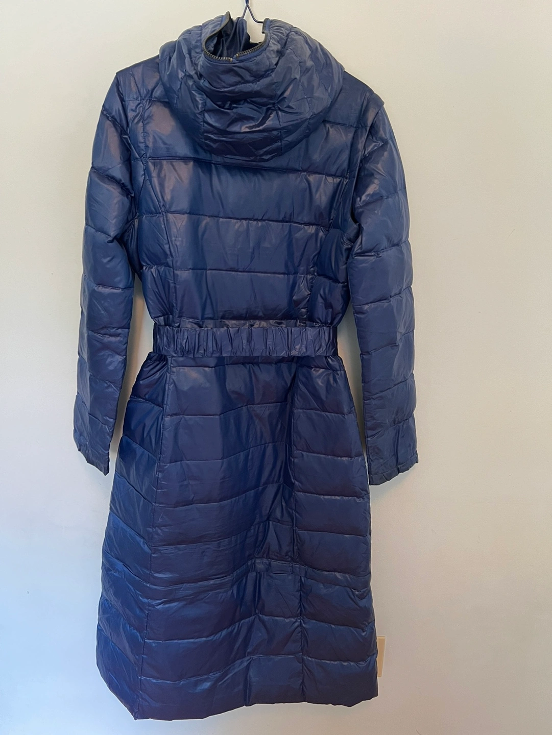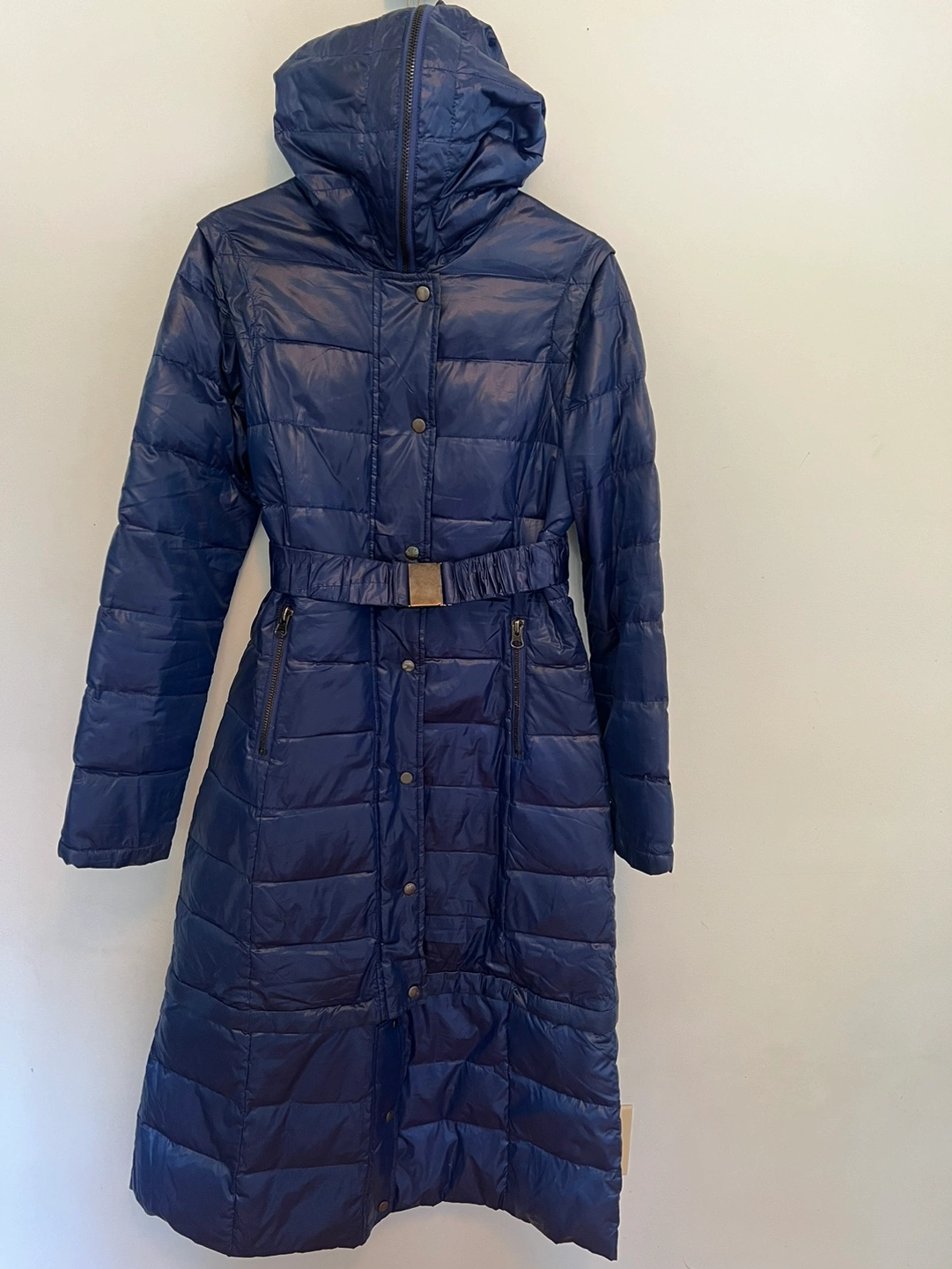 Navy blue puffer coat with a removable skirt, belt, and hood.