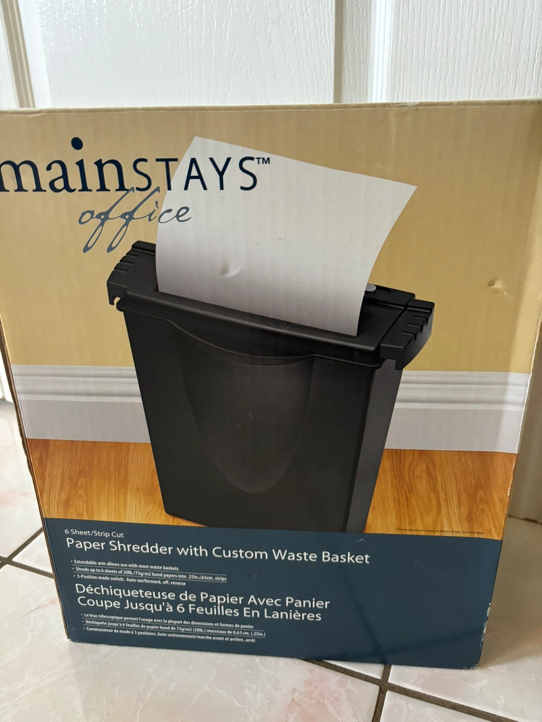 Black paper shredder with a custom waste basket. The shredder is designed for strips. It includes a safety feature that shuts off the unit if the waste basket is full. The shredder is also equipped with a safety switch that prevents it from being operated when the lid is open.