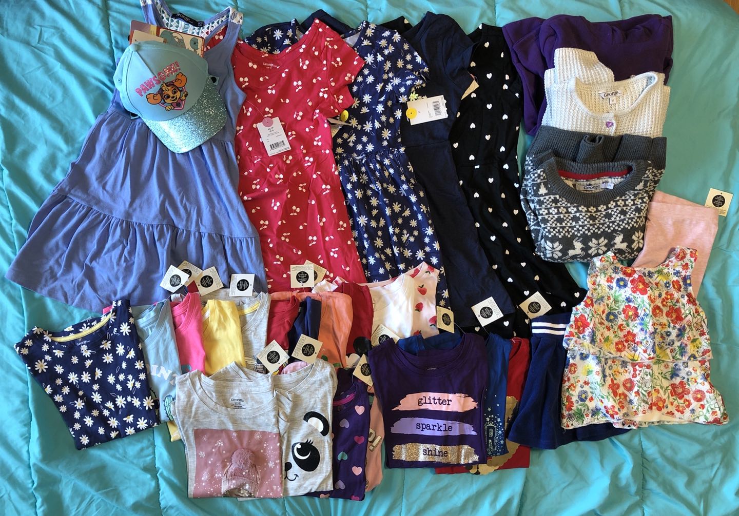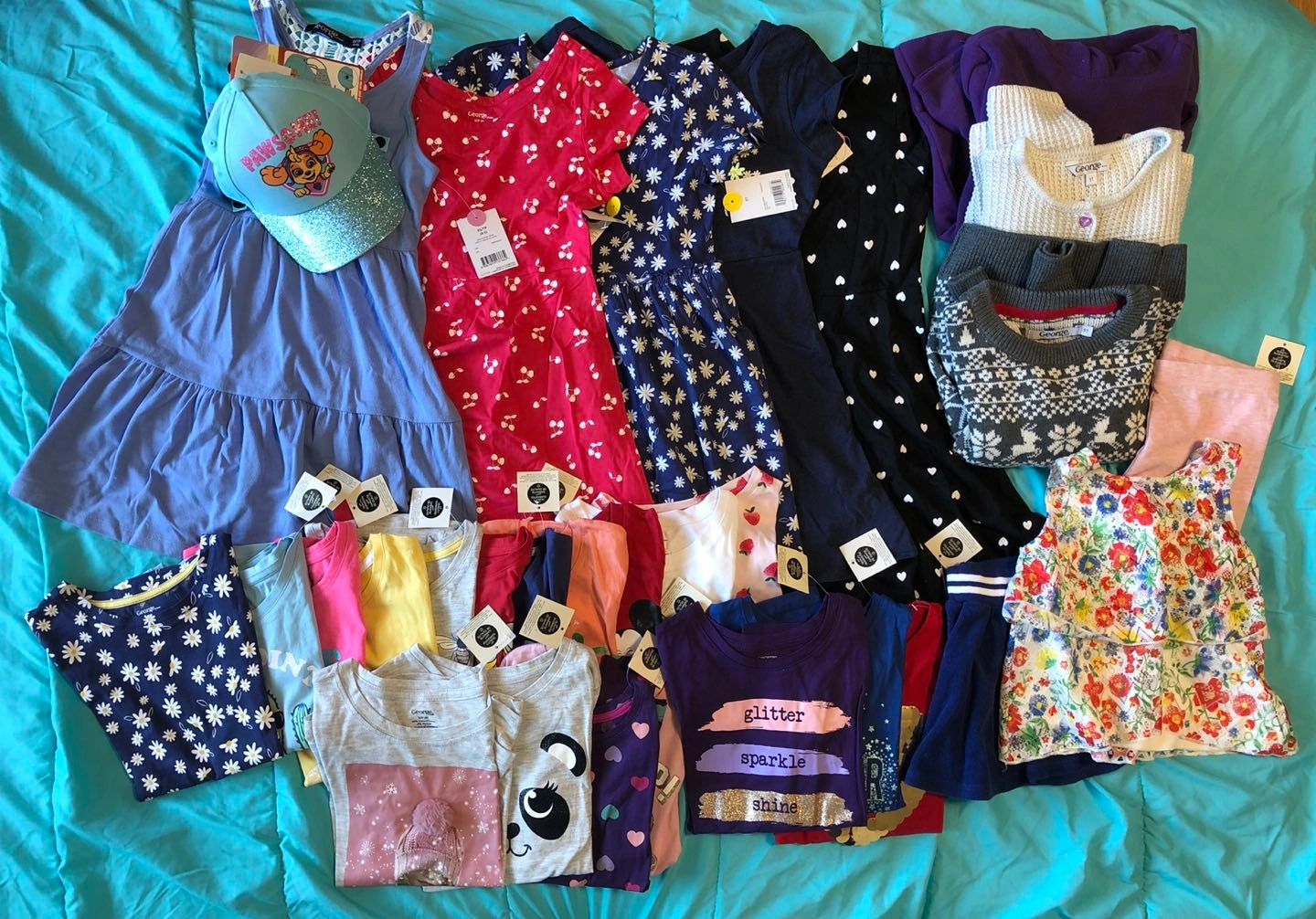 Girls clothes included dresses, short sleeves, long sleeves, sweaters, a hat, a skirt and a pair of pants. (Age 5-6)
