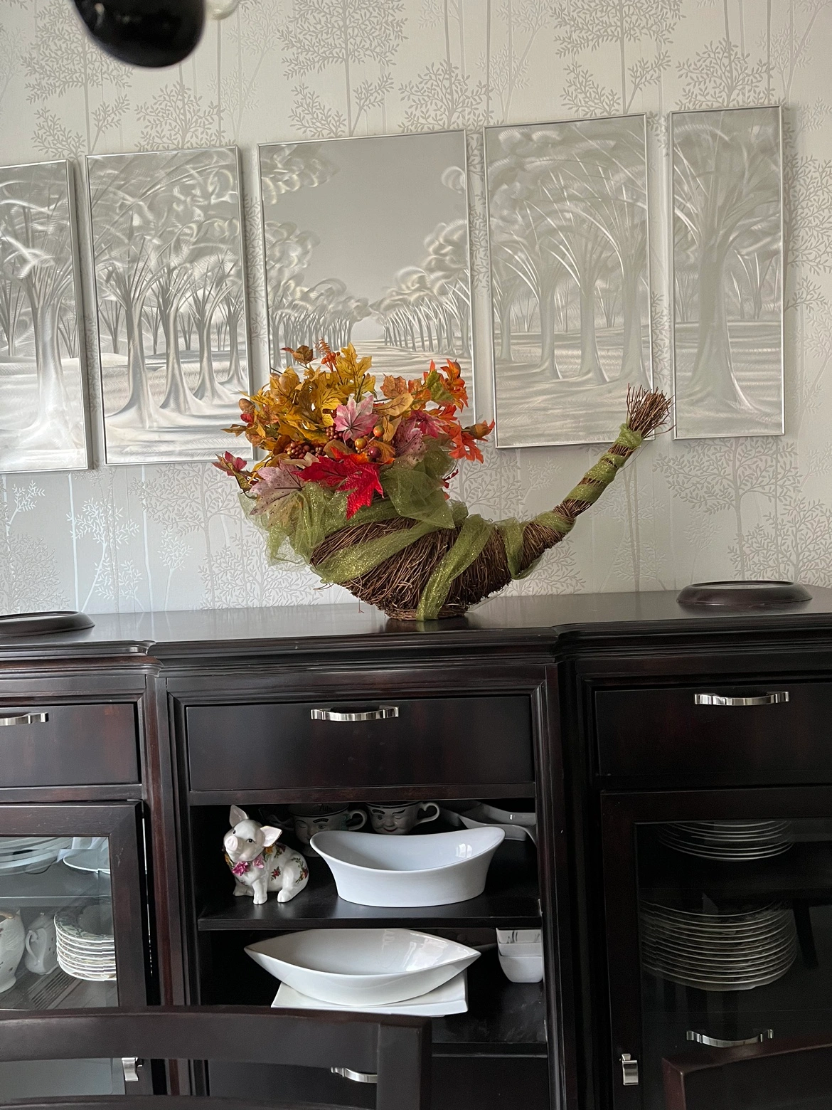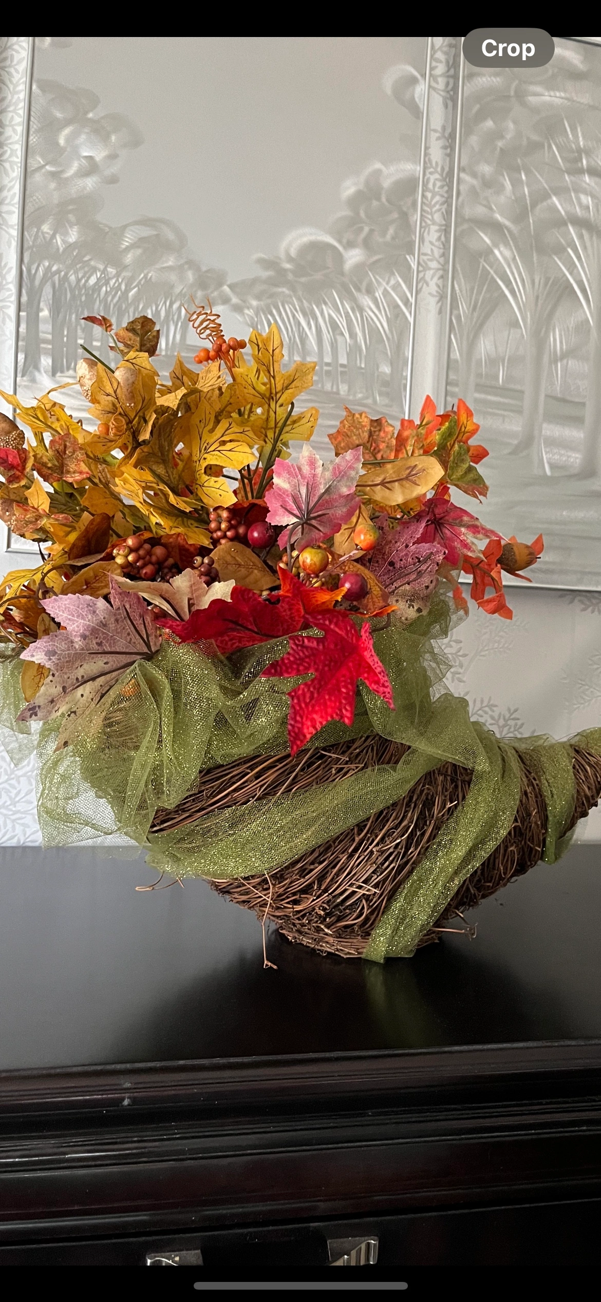 A beautiful large woven horn with fall-themed decor. Looks great on fireplace mantel or a centrepiece on table or buffet hutch as shown. reduced from 30.00