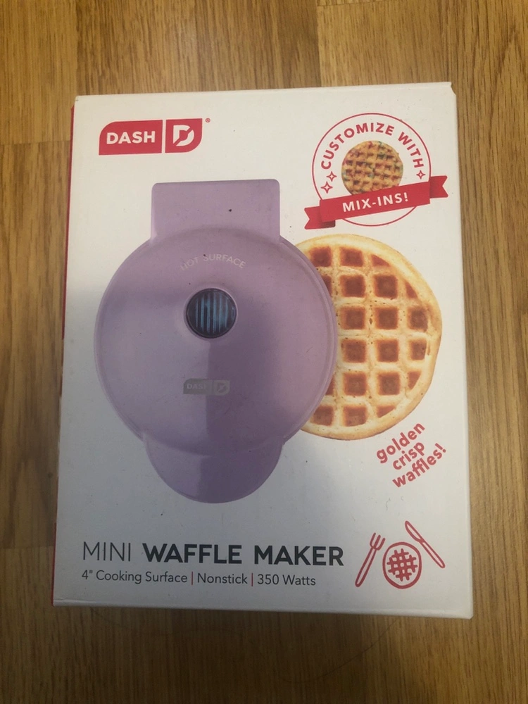 434Purple mini waffle maker with 4 inch cooking surface. Nonstick surface. 350 watts. Comes in original packaging.