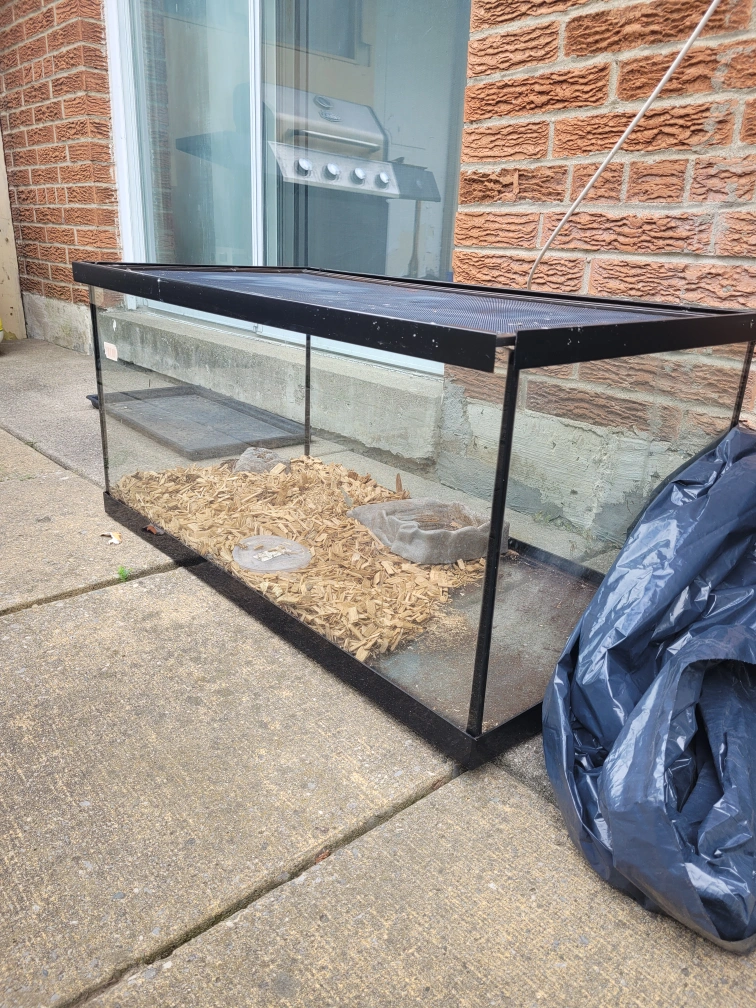 A large glass reptile tank. Suitable for a variety of reptiles. Comes with a screen top and a heat lamp fixture. Will be cleaned