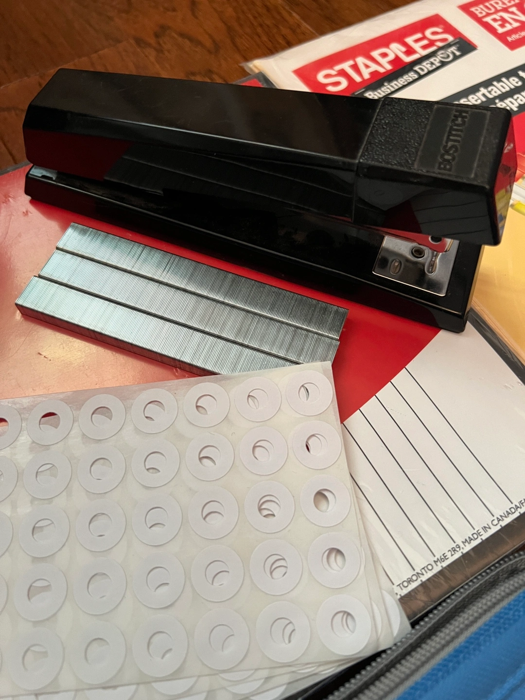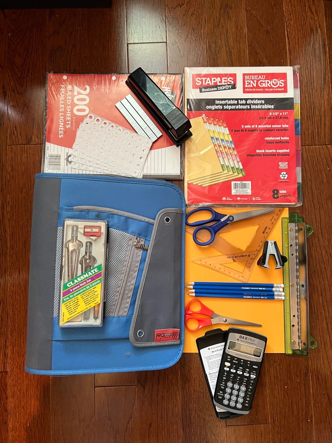 A variety of school supplies including a Texas Instruments Business Analyst calculator with brand new battery, zip-up large binder with dividers and zip pockets, math set with compasses, new package of 200 lined sheets of paper, new package of dividers, pencils, rulers, 2 scissors, a stapler with a extra staples, staple remover, paper hole puncher, 4 sheets of paper hole reinforcements.