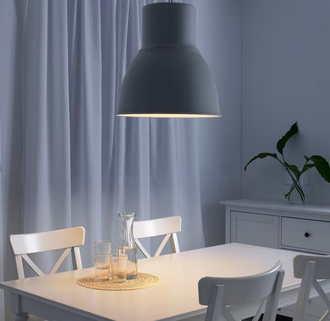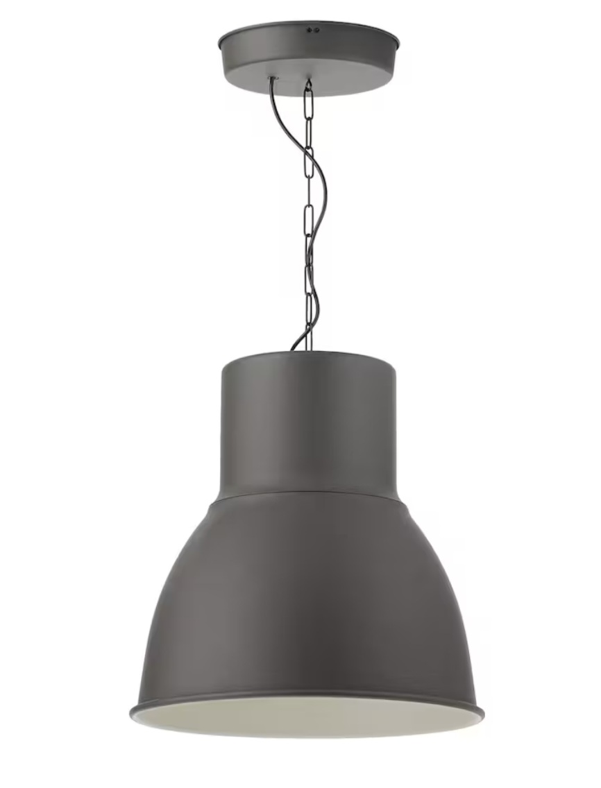 This is a pendant light with a dark grey shade. It is in good condition and comes with all necessary hardware.