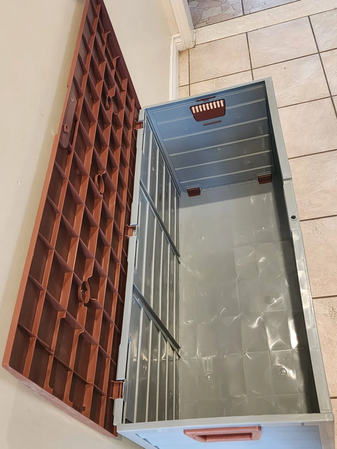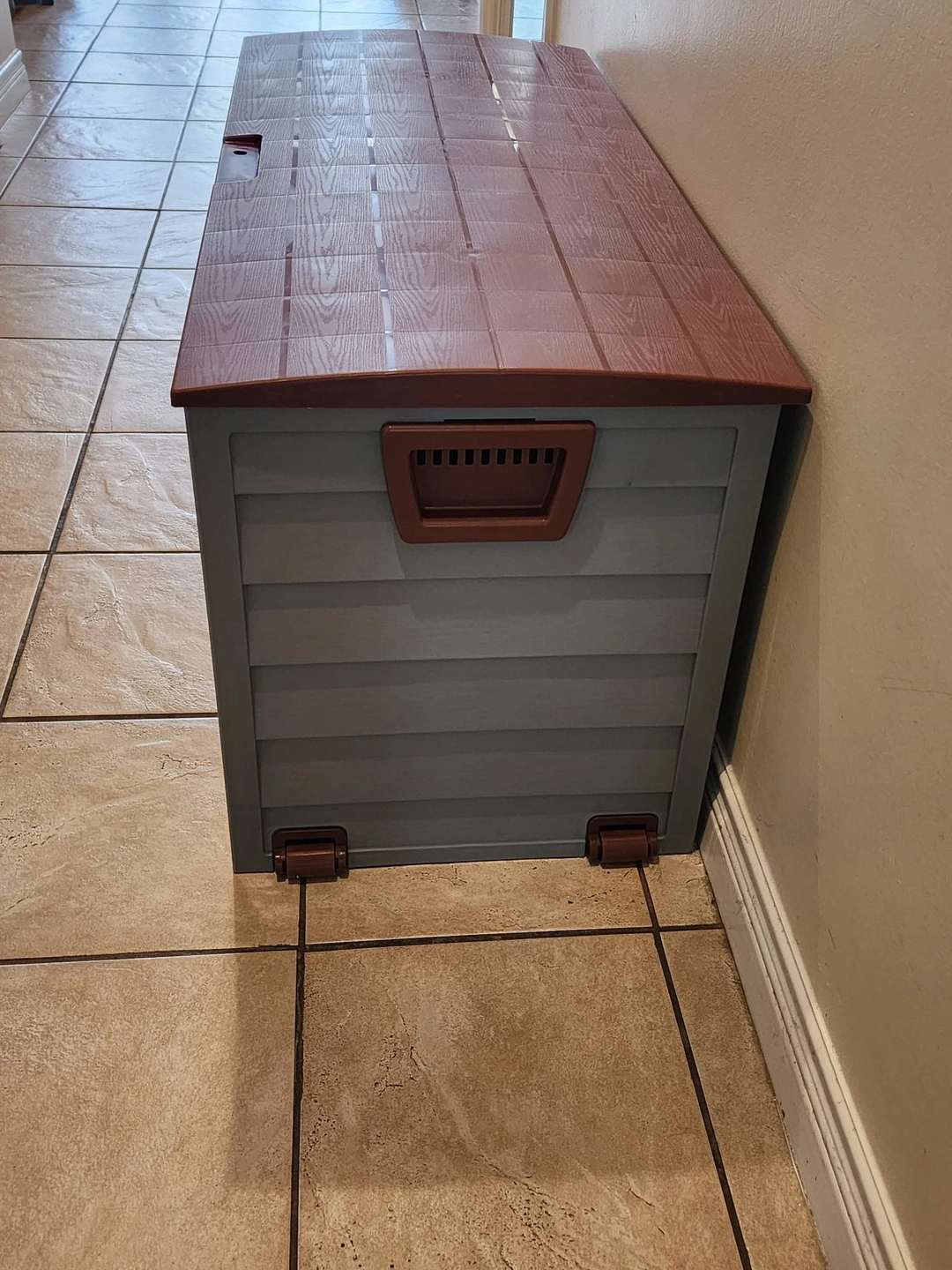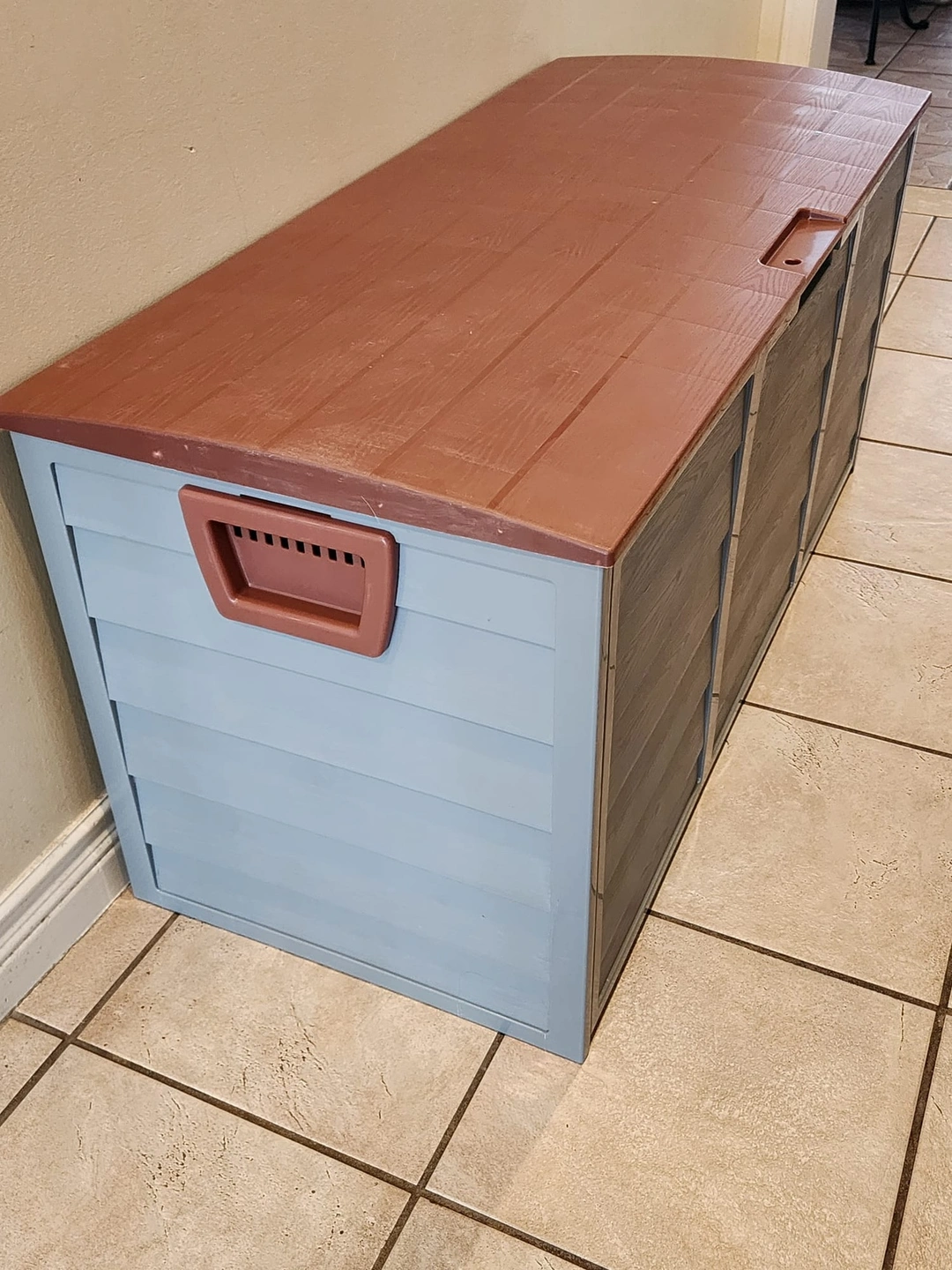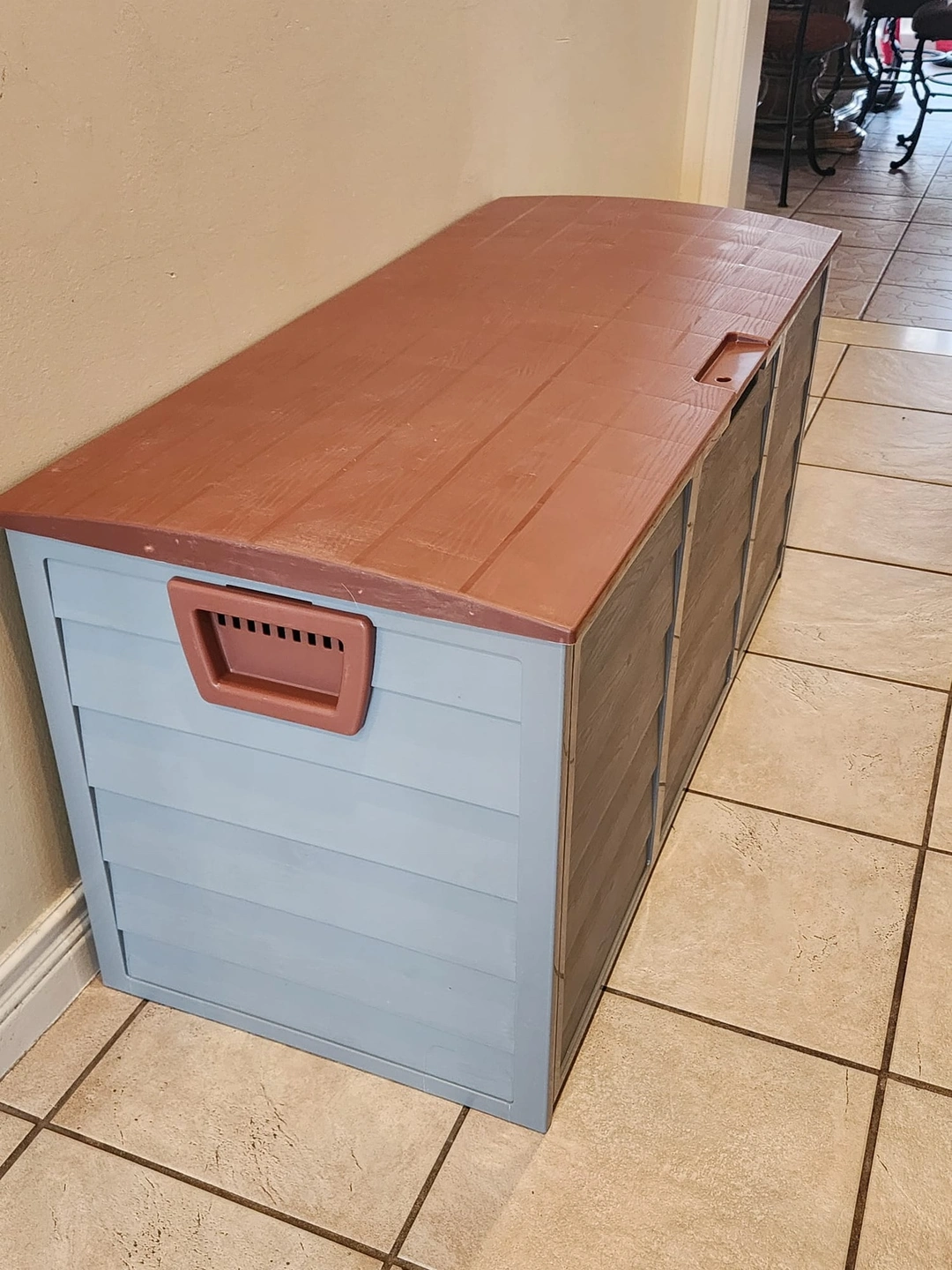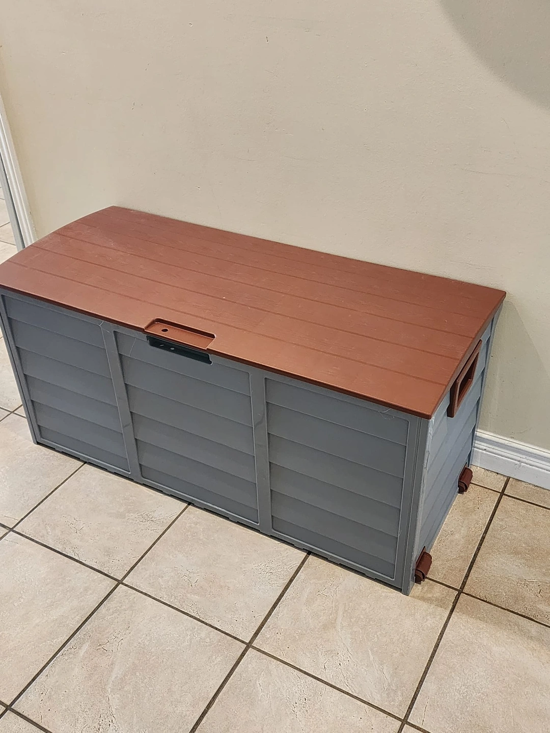40New assembled Retail price $349 plus taxes We are asking $150 quite firm Pick up only 16 th ave and 9 line Large storage chest with a hinged lid and wheels. Perfect for indoor or outdoor storage. It is made of durable plastic.