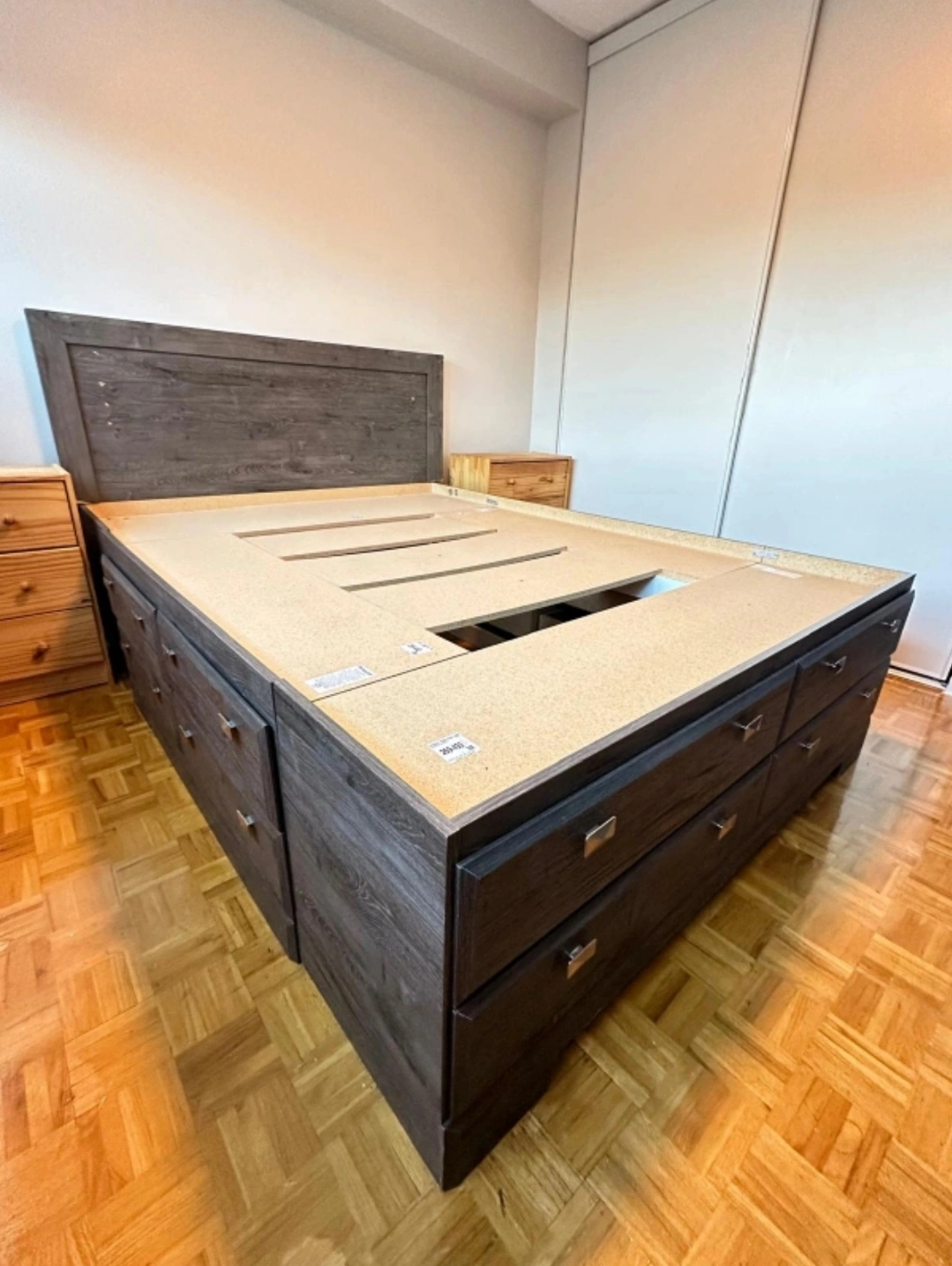 This bed frame features 12 storage compartments underneath the mattress and a headboard. It is in good condition. The bed frame is currently disassembled and ready to pick up. It has been used. There are some scratches from using the wrong screw, but it is structurally sound. Feel free to ask any questions!