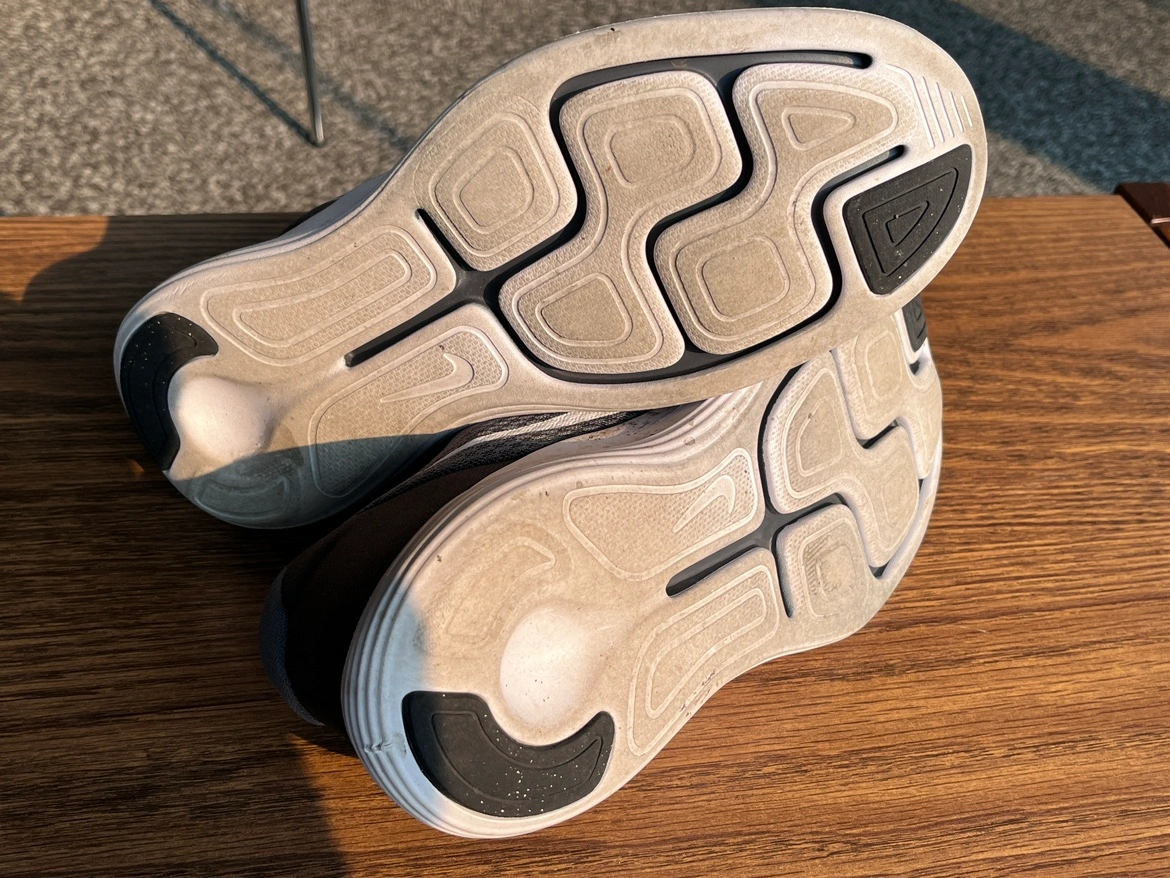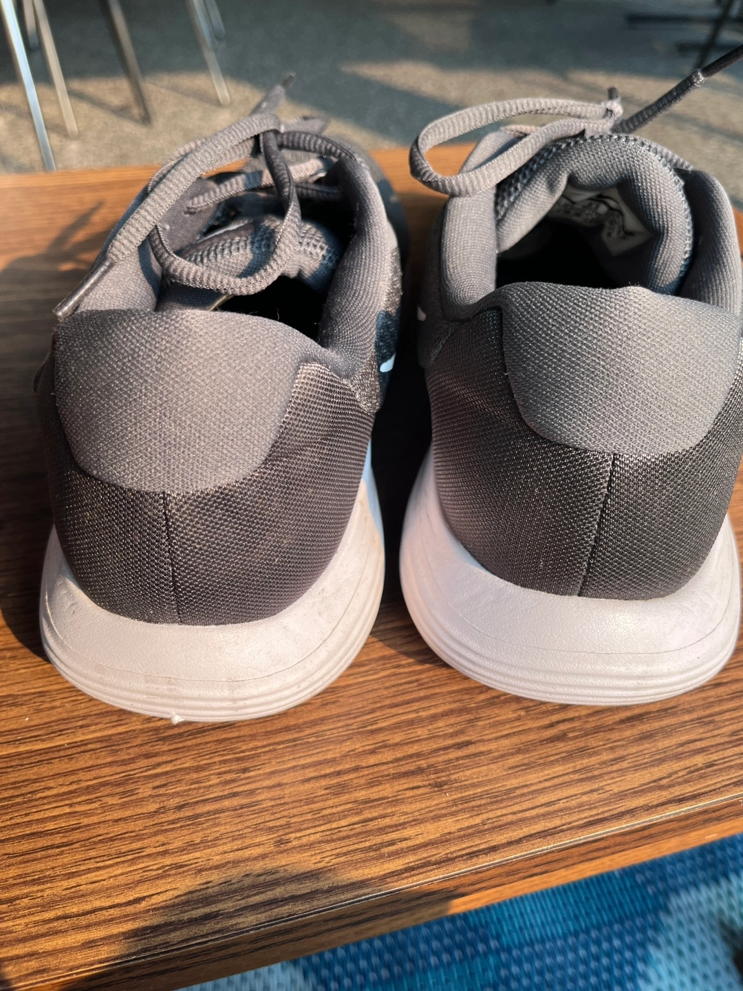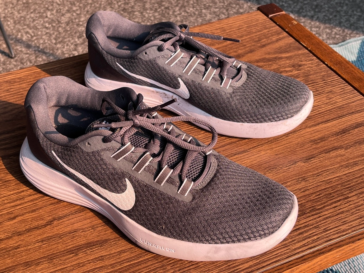 Lightly used Nike Grey running shoes with a white swoosh and white sole.