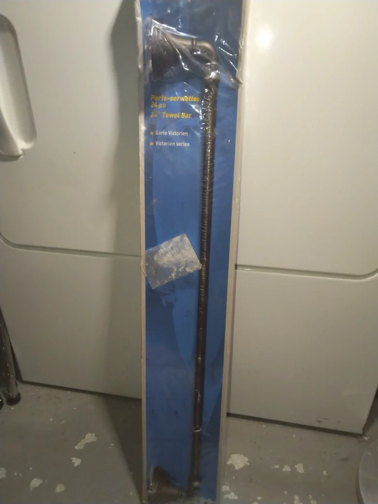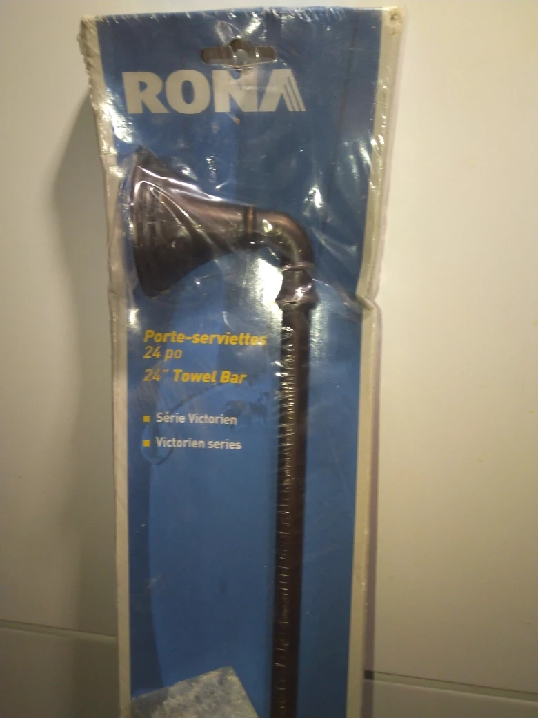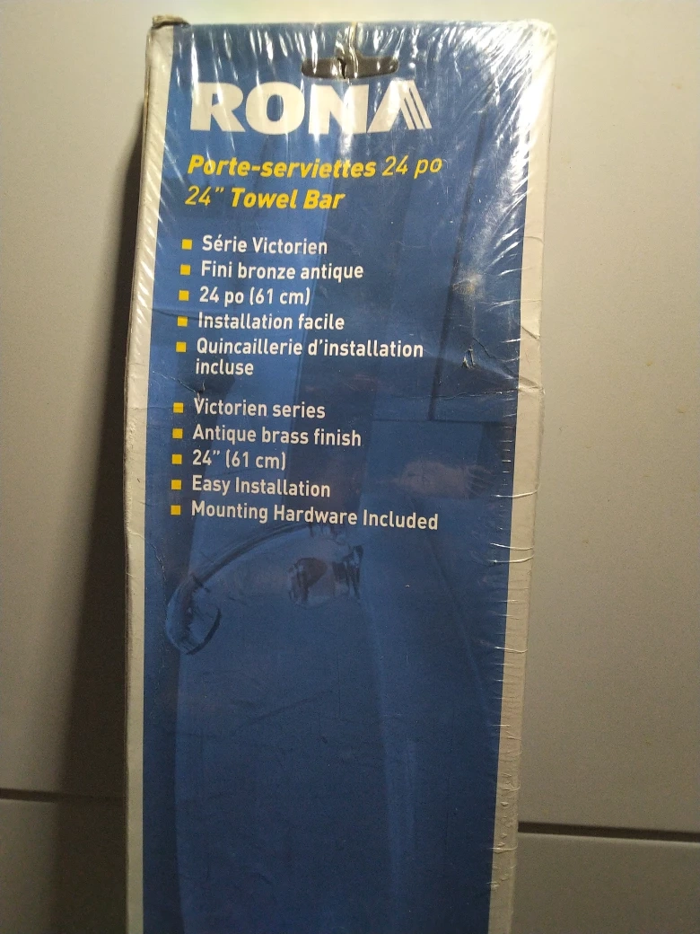 This towel bar is new and unused. It comes in the original packaging. It is 24 inches long. antique brass finish . It is from the Victorian series. It includes the mounting hardware