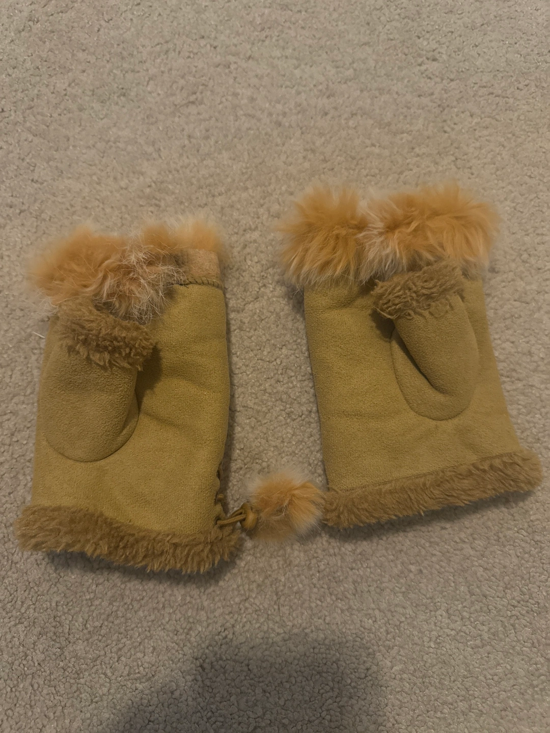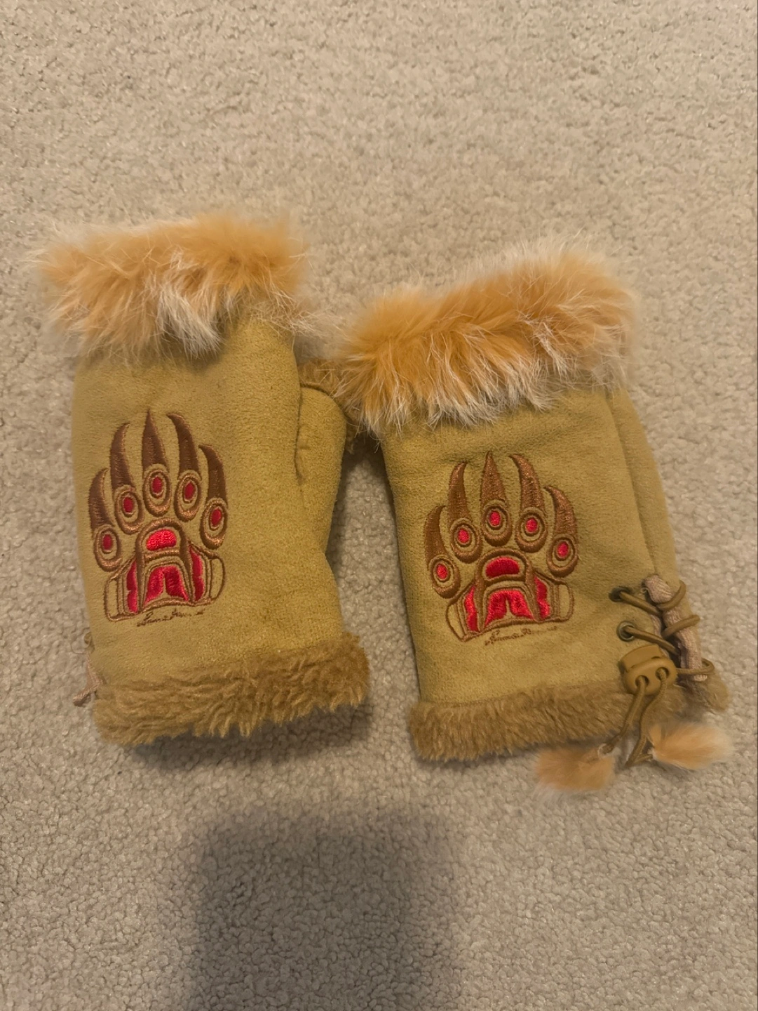 These mittens have a fur cuff and are lined with fleece. They feature an embroidered bear paw design on the back. *first come first serve