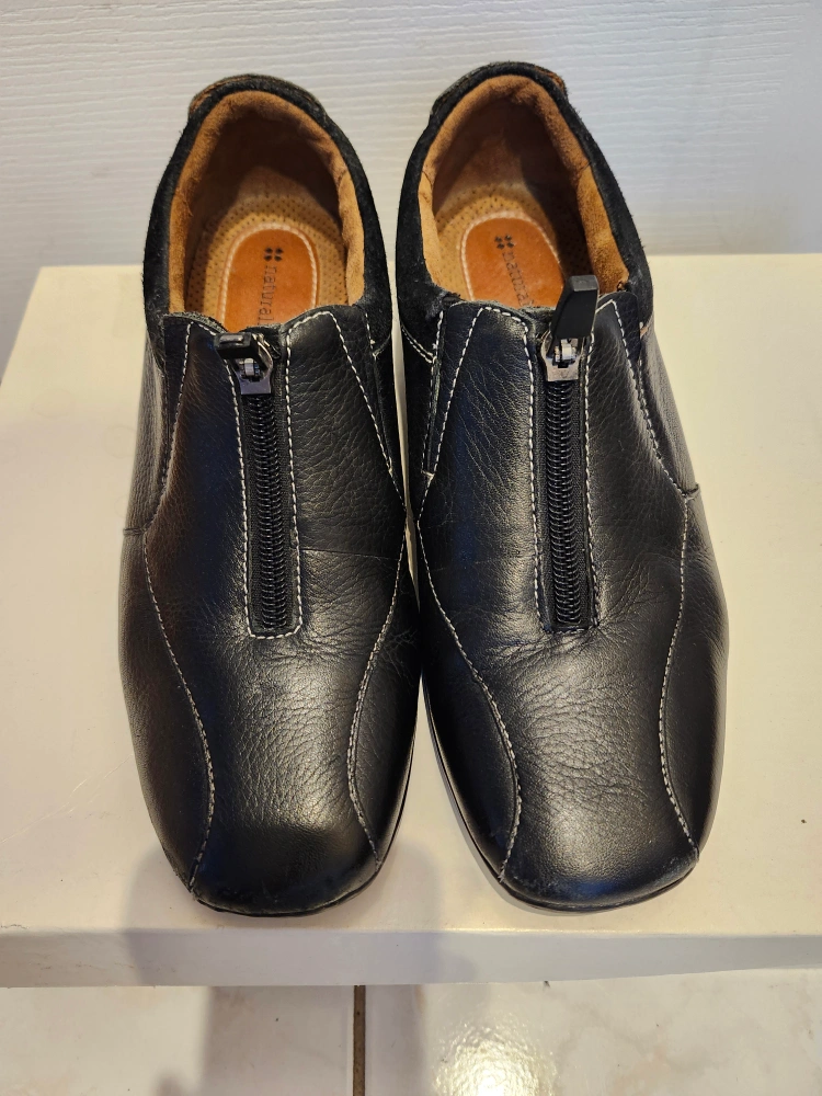496Black leather slip-on shoes with a zip closure. Size 8M Cushioned footbed for comfort. In excellent condition.