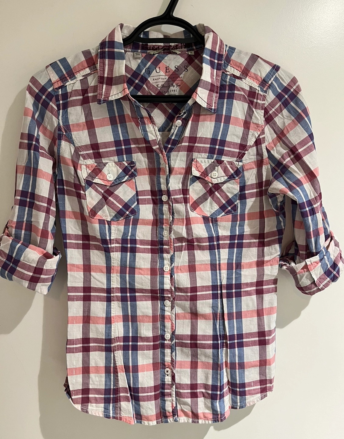 This women’s button-up shirt showcases a classic plaid pattern and features roll-up sleeves. It is made of a soft and comfortable fabric.