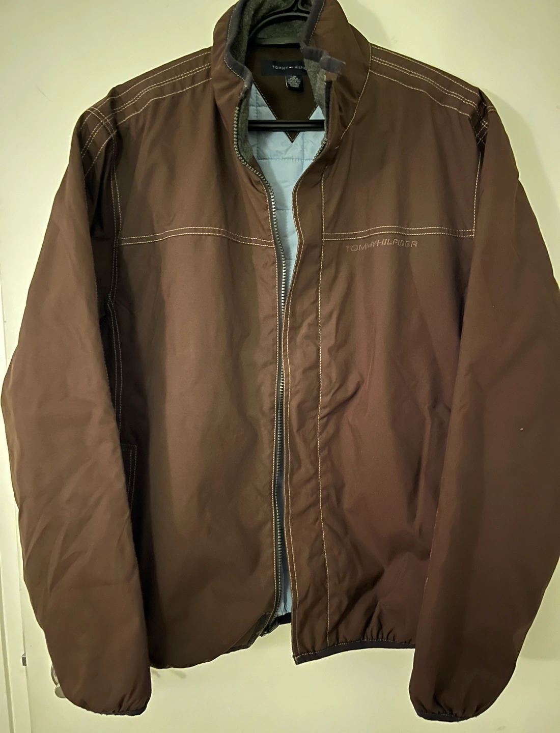 Brown Tommy Hilfiger jacket with a front zipper and two side pockets.