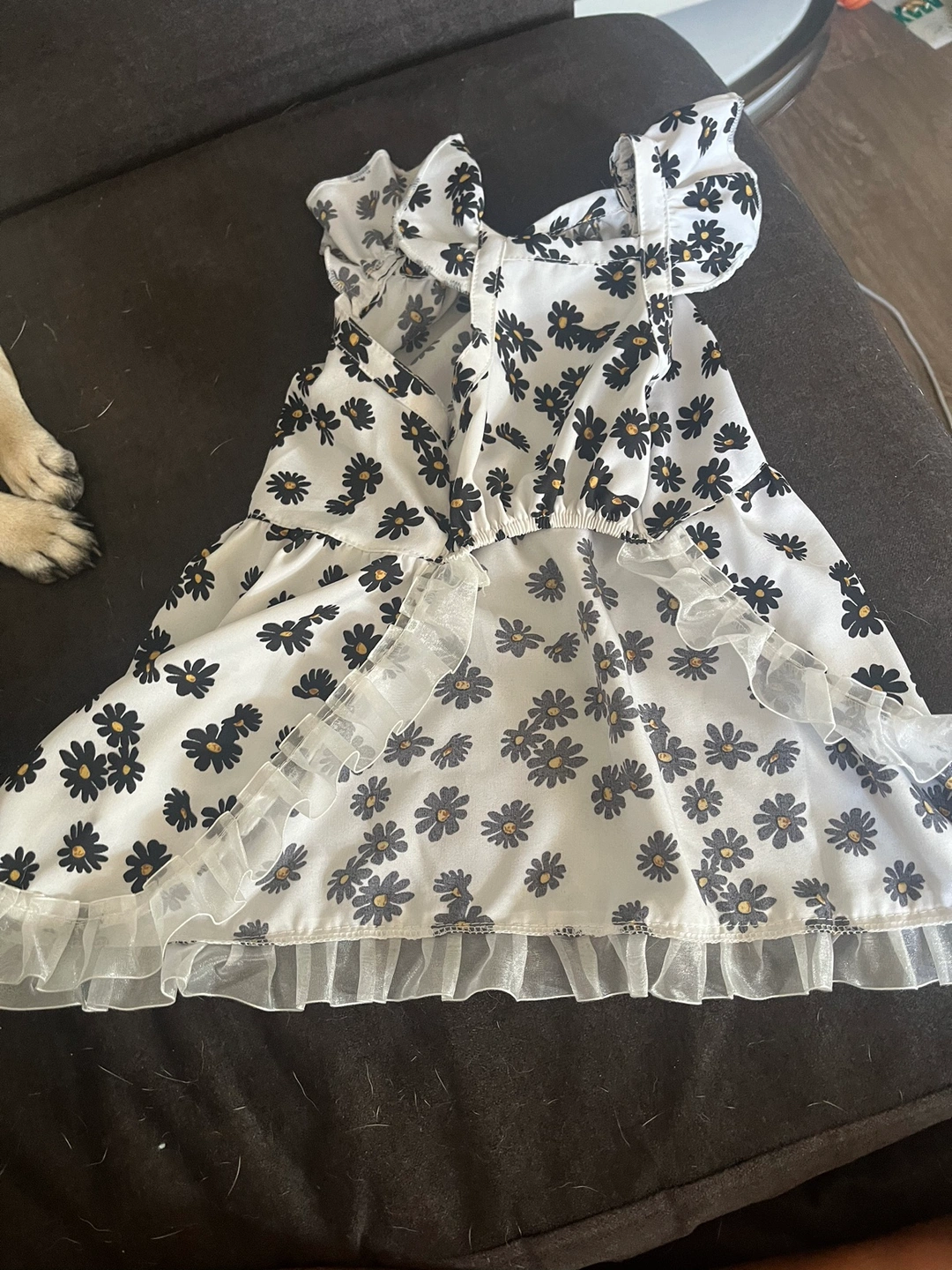 White dress with black daisies and a tulle trim. Very cute but it looks weird on my Lola it’s for small breed of dogs. My pug is about 12 pounds.