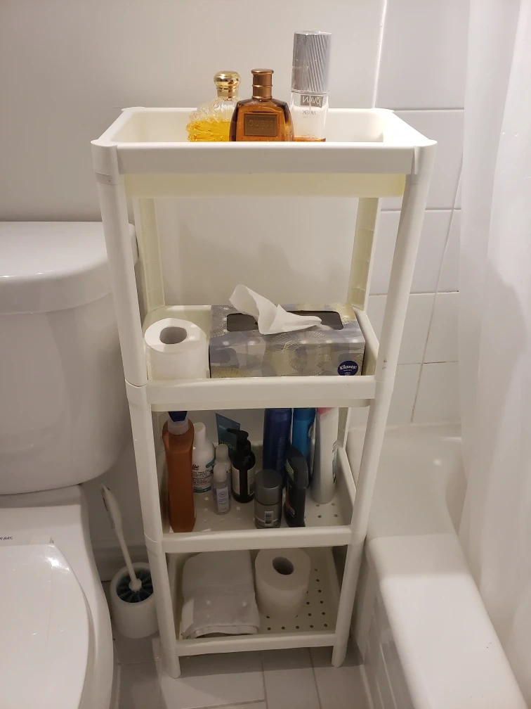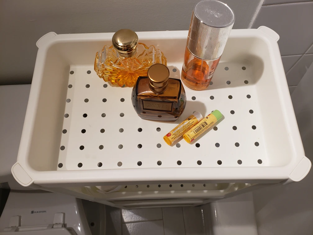 White four-tier shelf, with perforated shelves. Great for storing toiletries or other small items. (Please note, this does not include the items in the photos.)