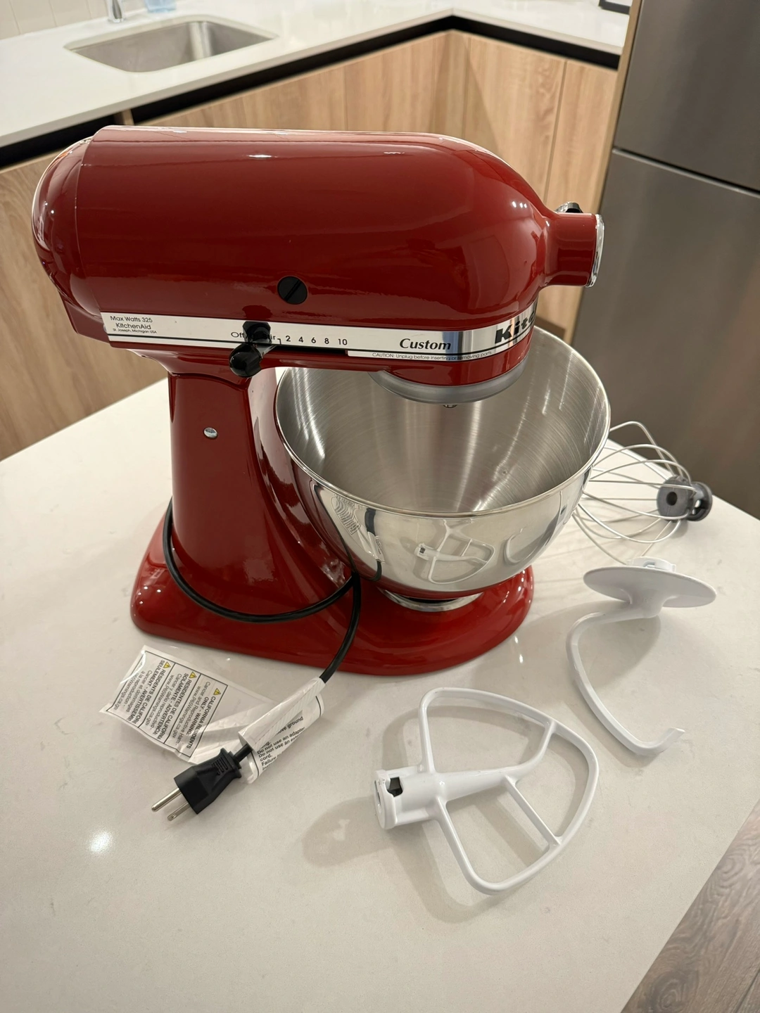10Red KitchenAid stand mixer with attachments. It has a stainless steel bowl and a variety of attachments. In immaculate as new condition. Used only 2-3 times. Rare, highest rated model and colour combination. See: https://www.kitchenaid.ca/en_ca/countertop-appliances/stand-mixers/tilt-head-stand-mixers/p.tilt-head-stand-mixer.ksm120er.html