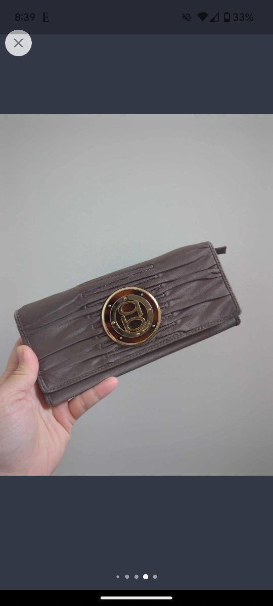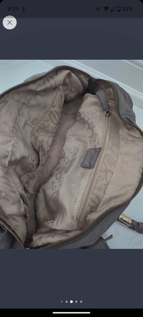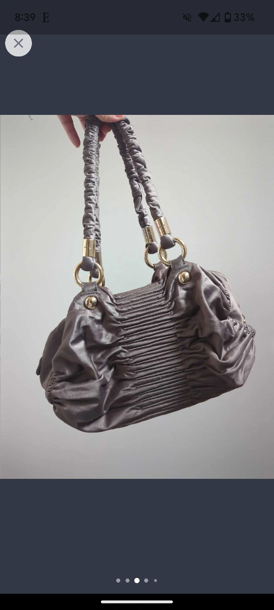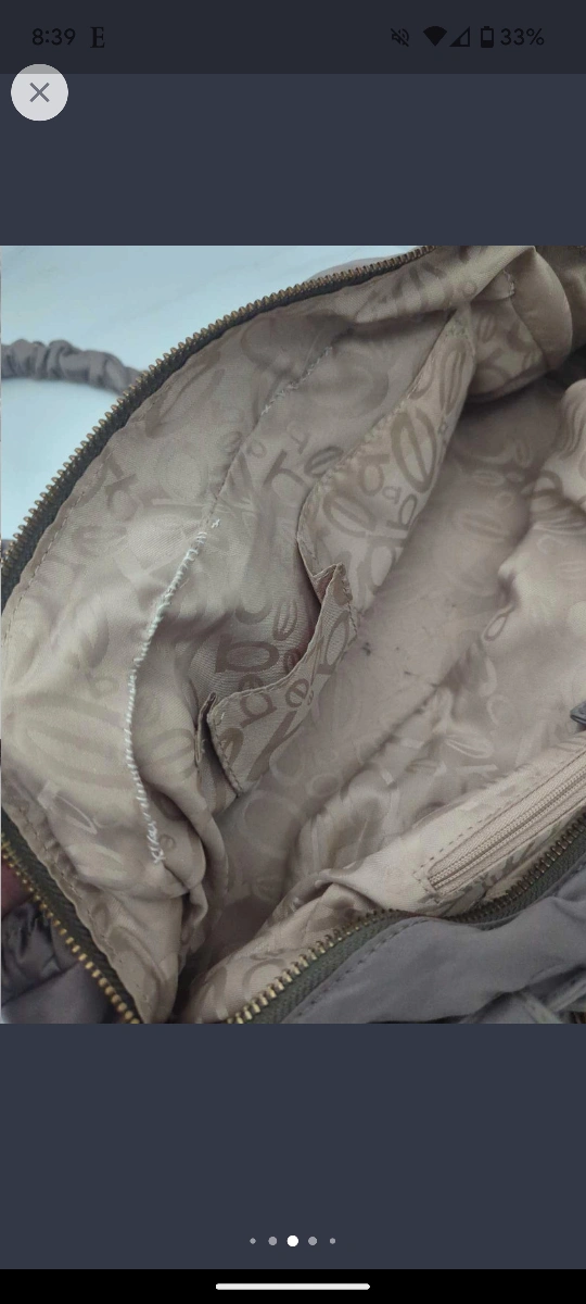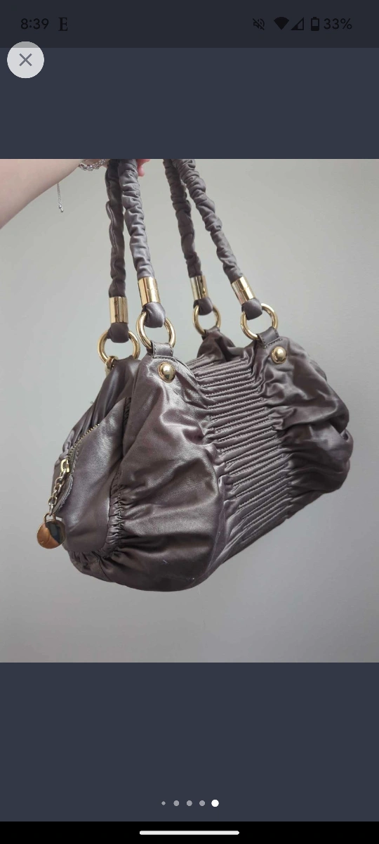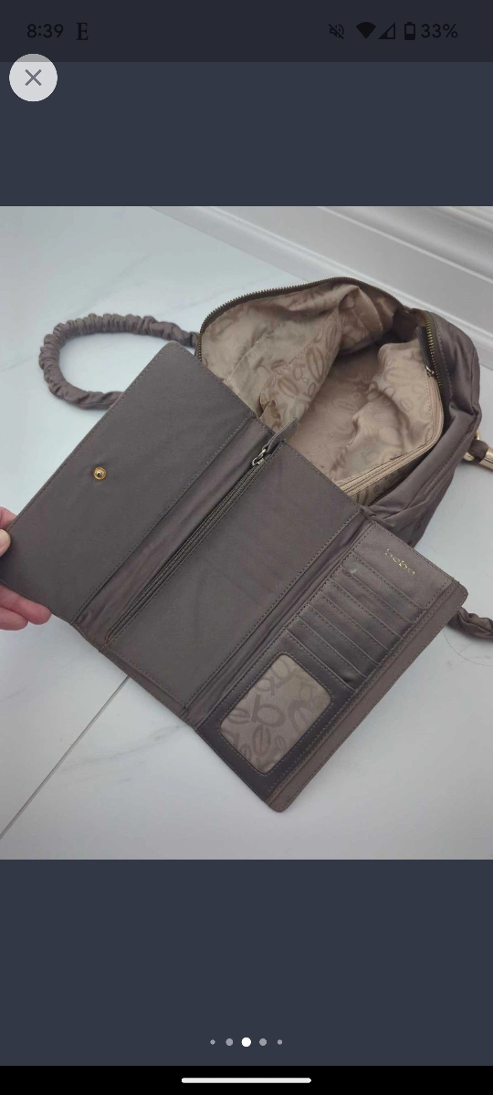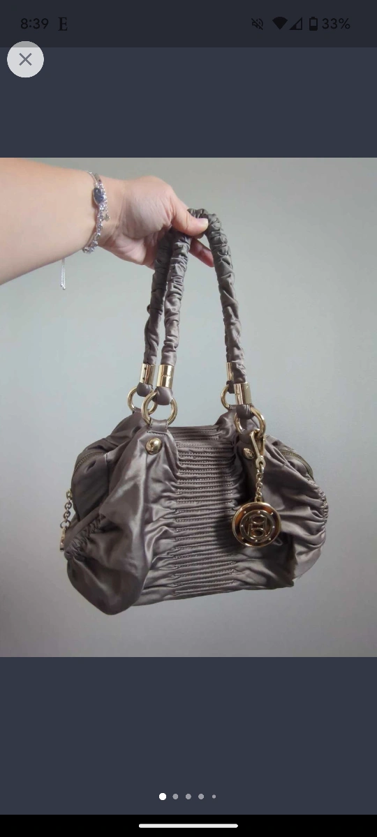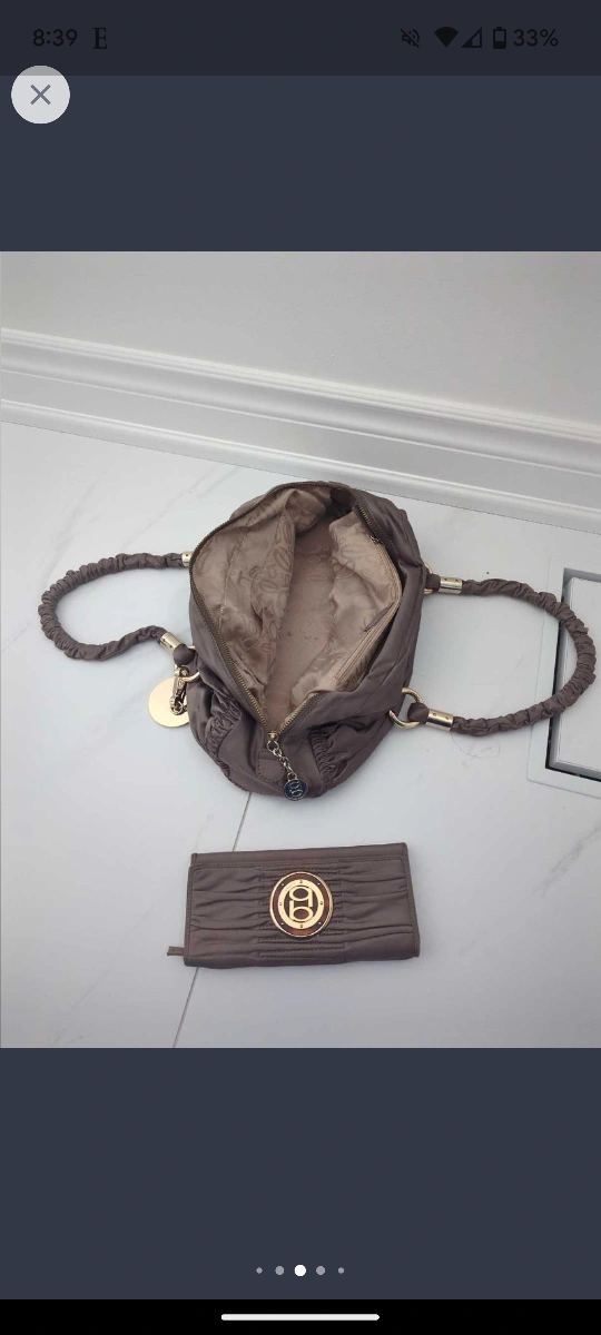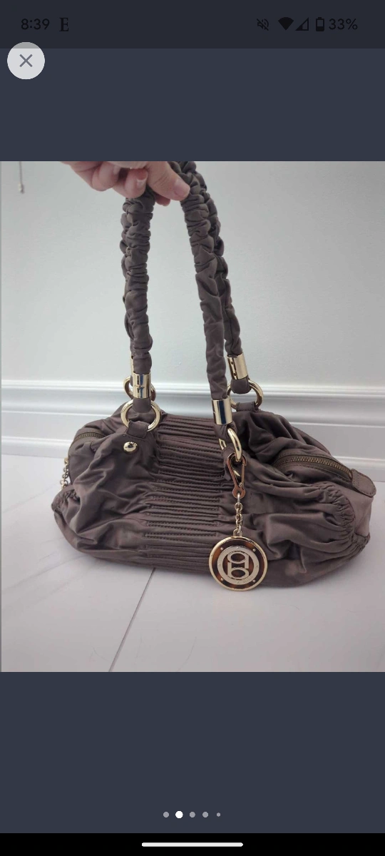army green handbag with gold accents. The bag has a zipper closure and a chain strap. It has a round gold charm with the letter 'B' for bebe on it. Nice set, fall colour. 15" long, 8" height without handle. 18" height with handle. Bebe brand, used. Please note easy sale at Union station weekdays or 298 John St Thornhill. Cash only, thanks