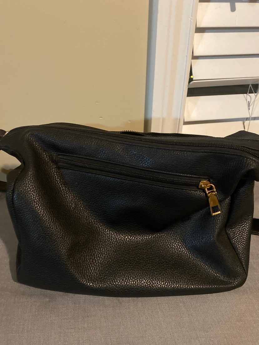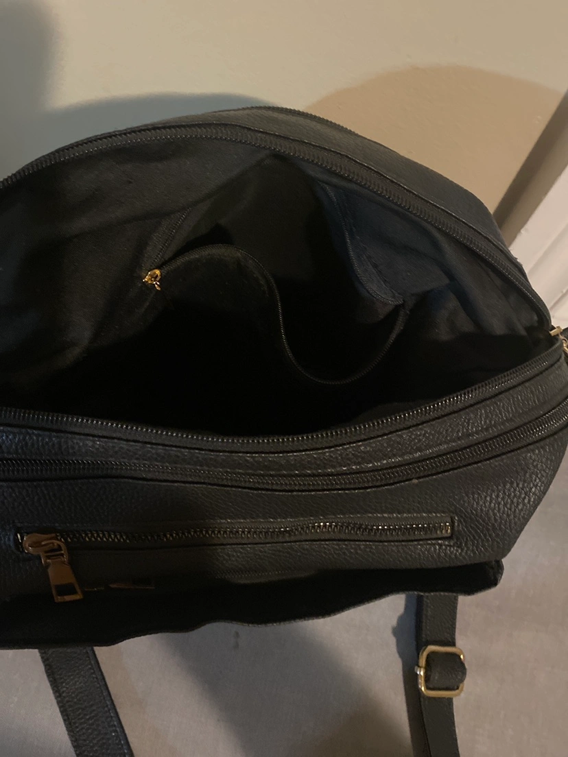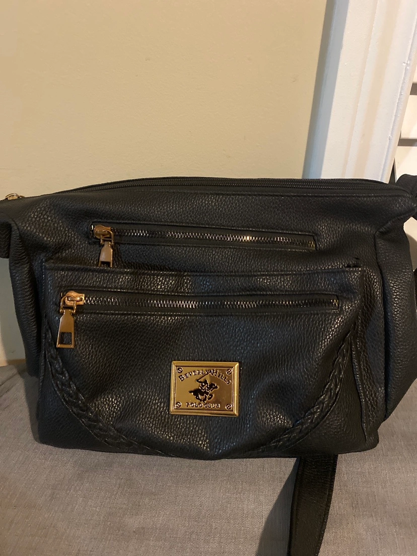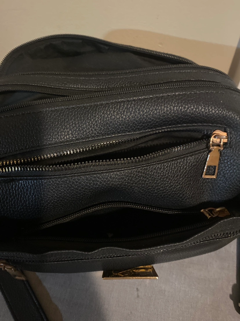 Black crossbody bag with gold hardware. Features a small inner pocket and a zippered closure. The bag comes with an adjustable strap.