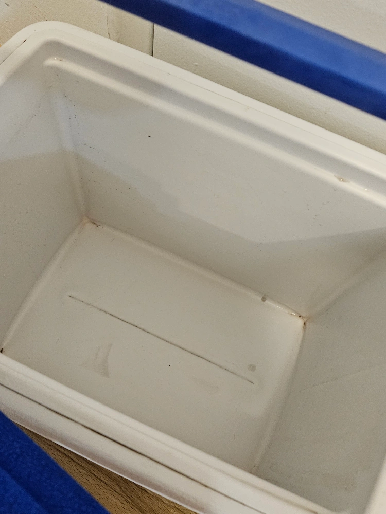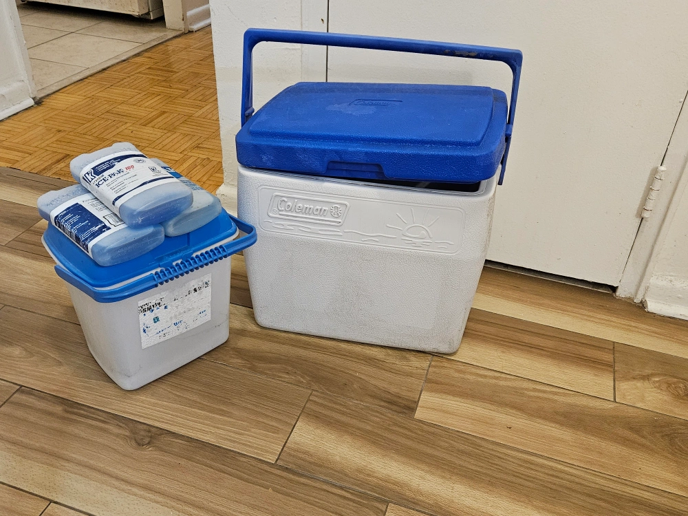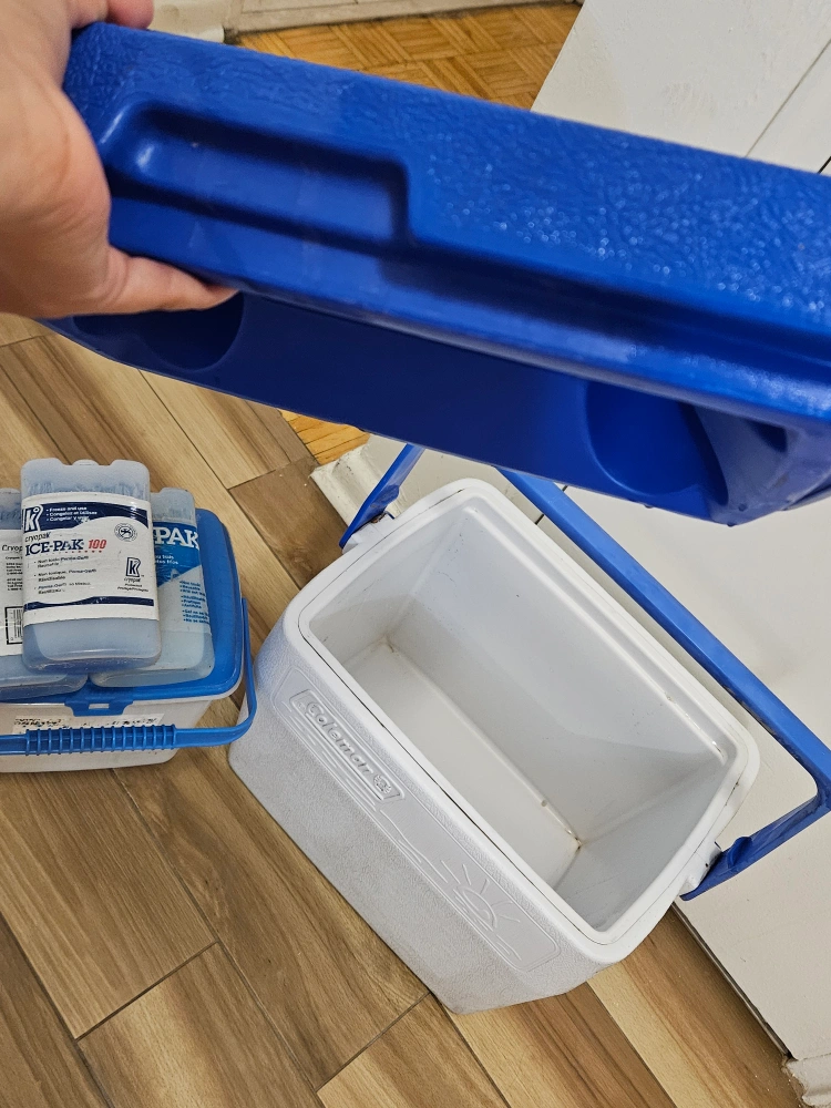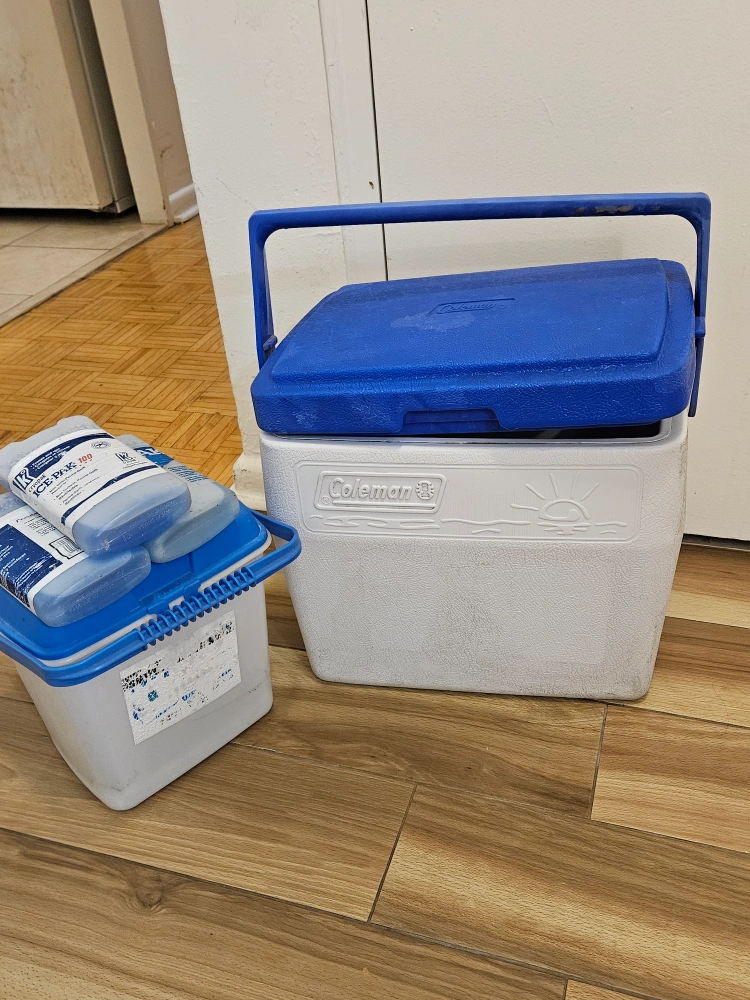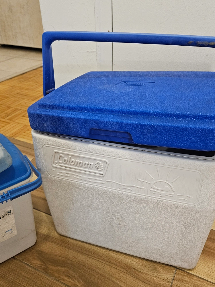 207good for outings and picnics outdoor Coleman cooler with blue lid and white body. smaller blue cooler is also included. There are four blue ice packs inside the smaller cooler. The smaller cooler has a handle on the top. take all