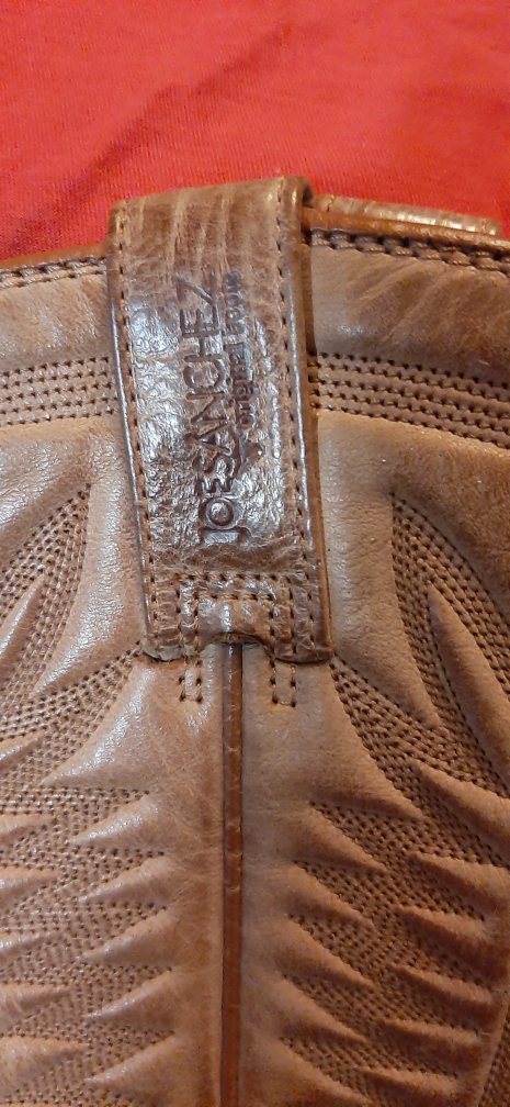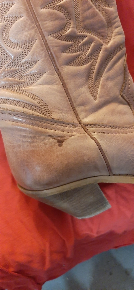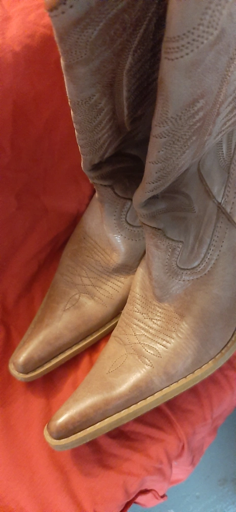 Joe Sanchez women's tan leather cowboy boots with a pointed toe and a wooden heel. The boots have a decorative stitching pattern on the shaft. The boots are in good condition. Size: 6