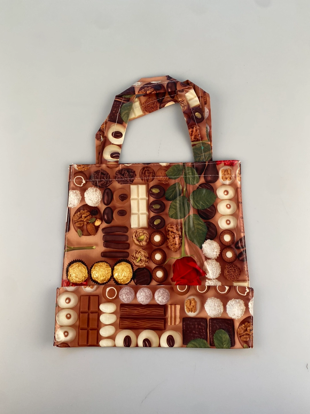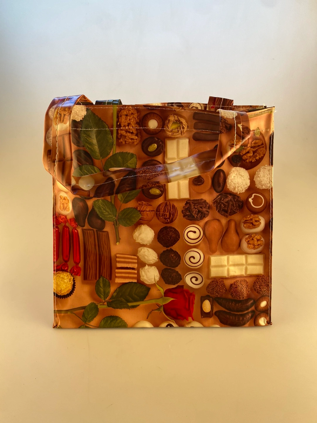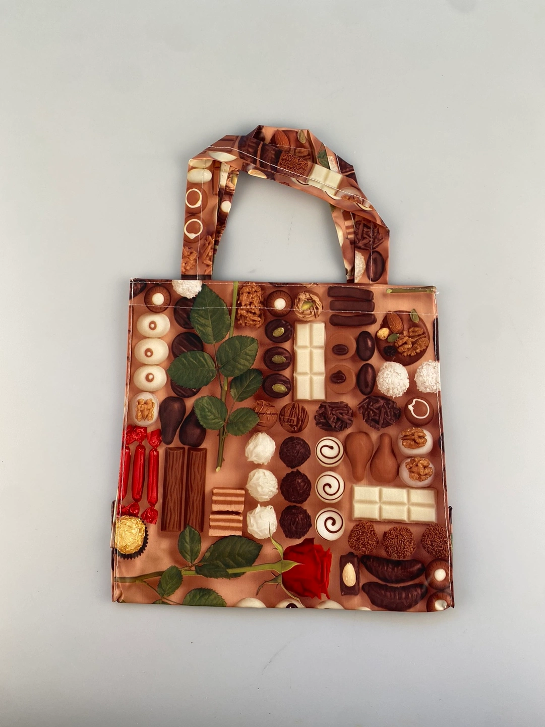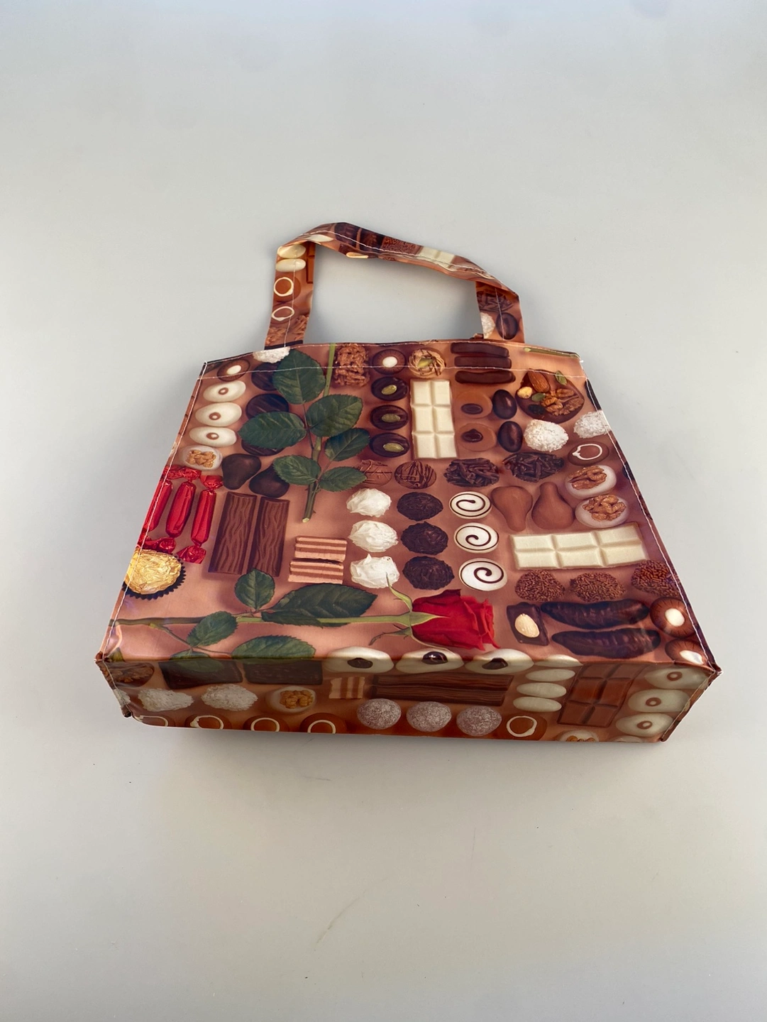 Reusable tote bag featuring a chocolate and rose design. The bag is a great way to show your love for chocolate! It is perfect for carrying a few groceries, books, or other small items. Made in Italy. Ready for pickup.