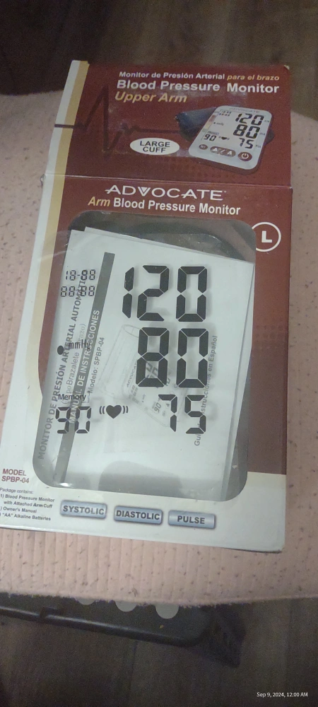 A blood pressure monitor with a large cuff. Includes instructions,just needs double AA battery it's new never been used,es nuevo tienes que comprar baterias doble AA