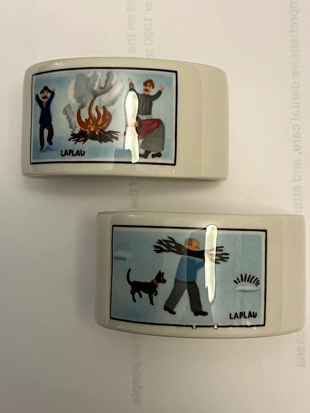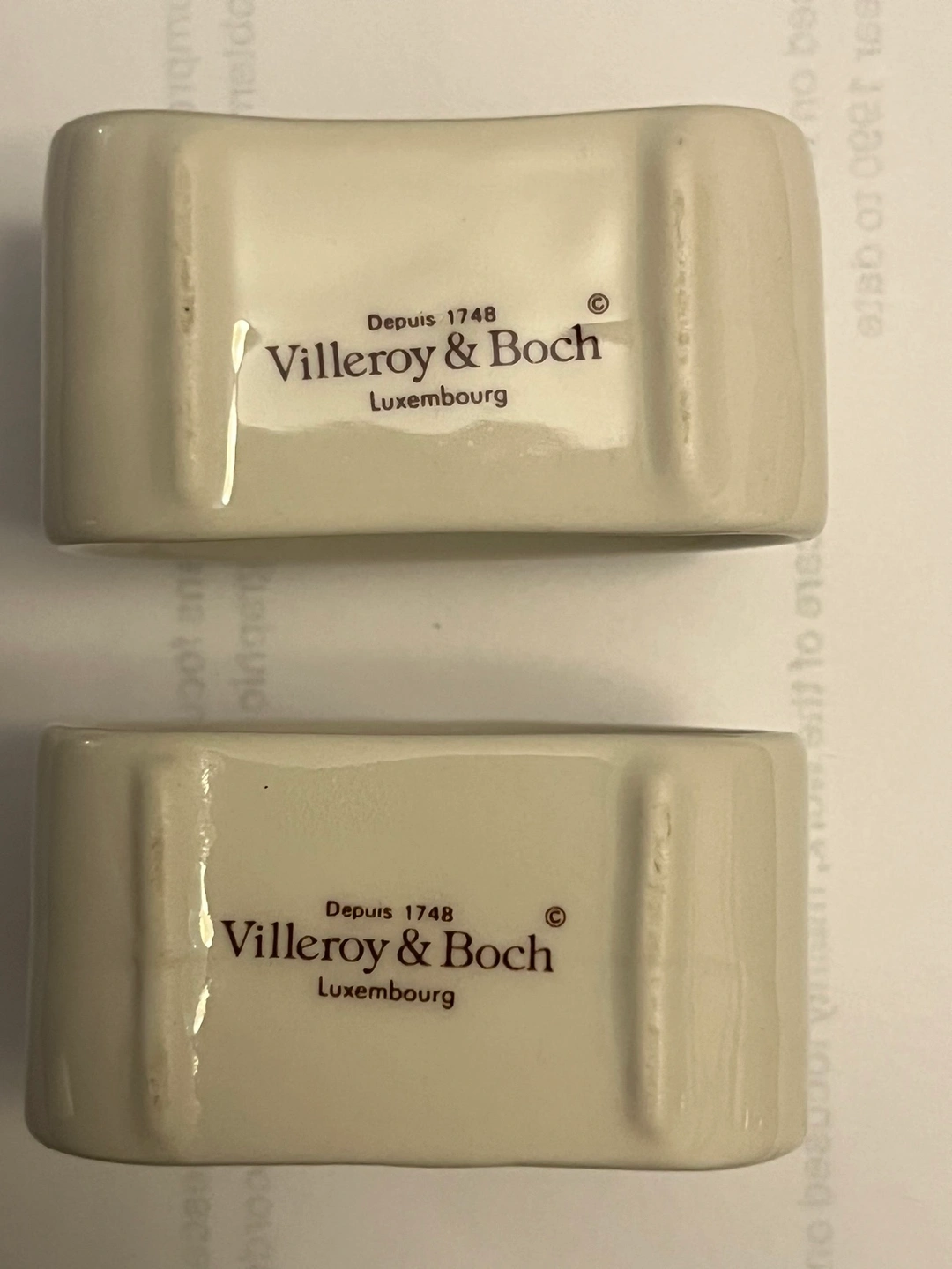 Set of 2 porcelain Villeroy & Boch napkin rings featuring a Laplau blue and white design. Made in Luxembourg.