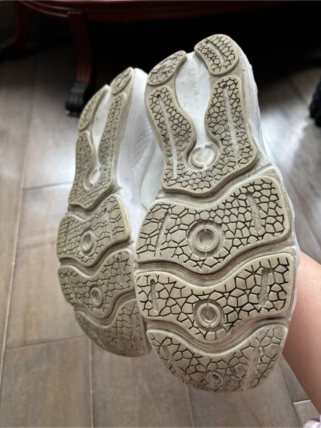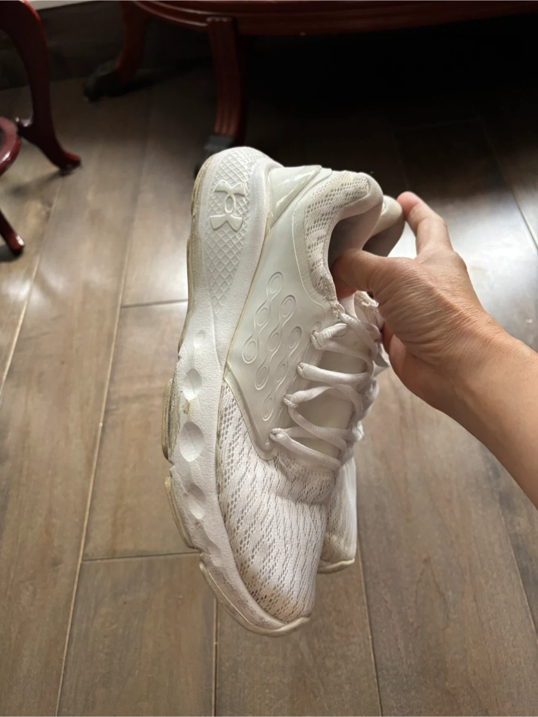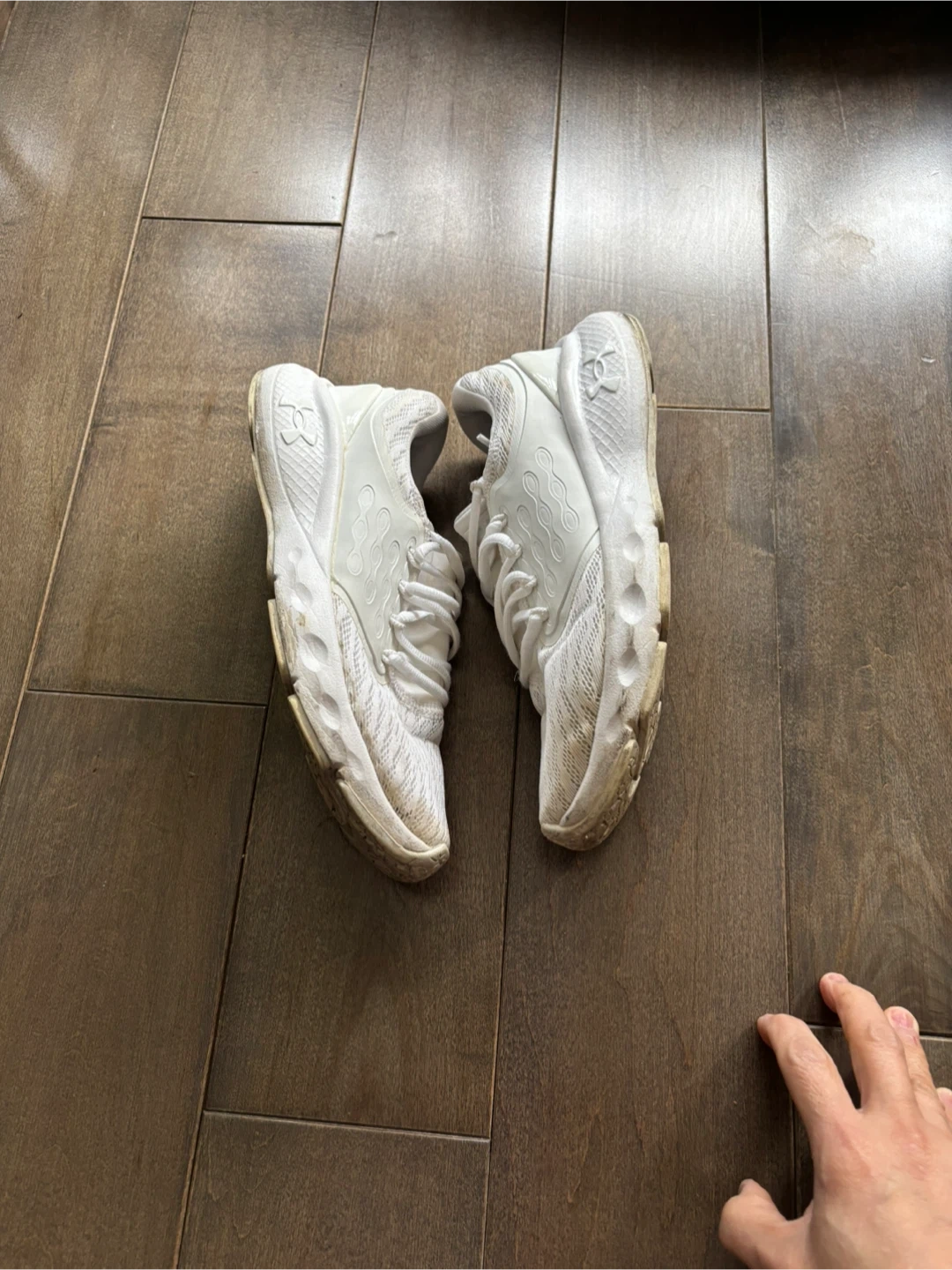 These are a pair of white Under Armour running shoes. They're made with a mesh upper and a durable rubber sole for good traction. These shoes are great for everyday wear or for hitting the gym!