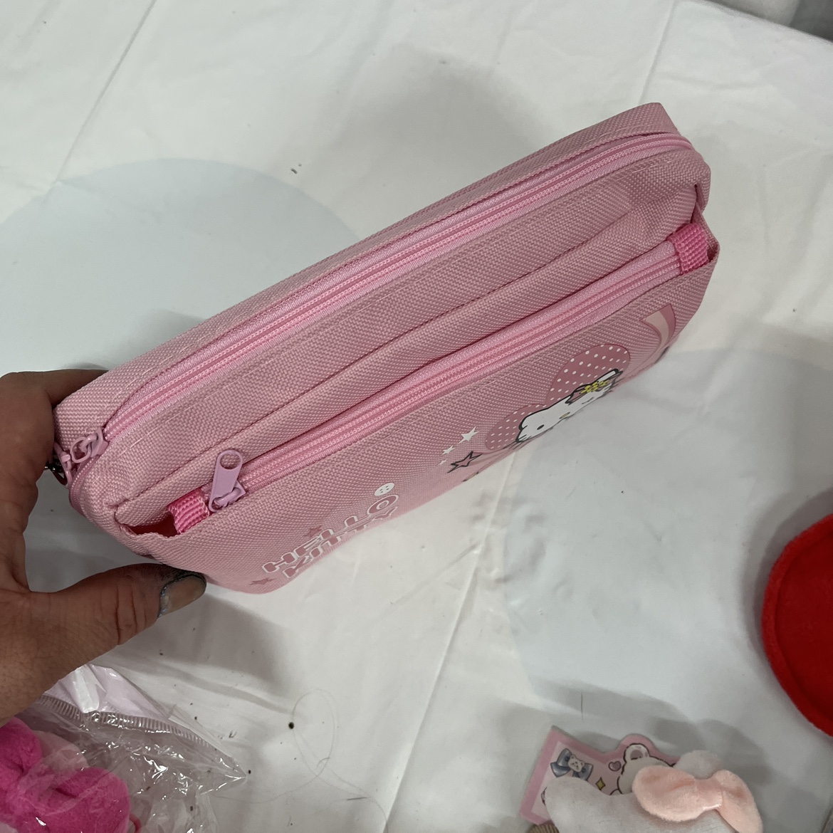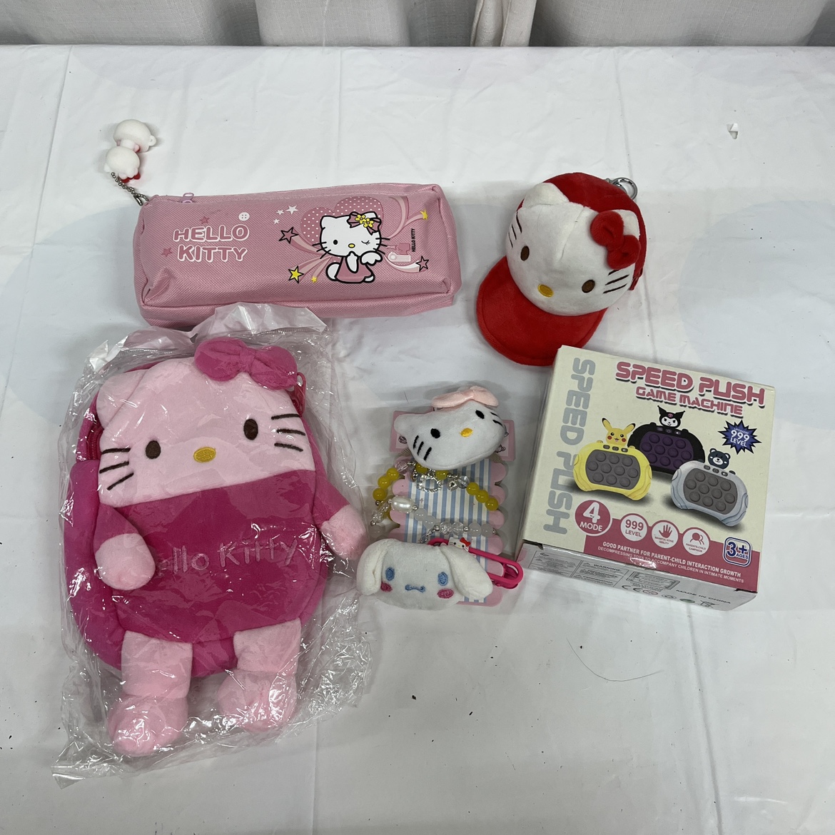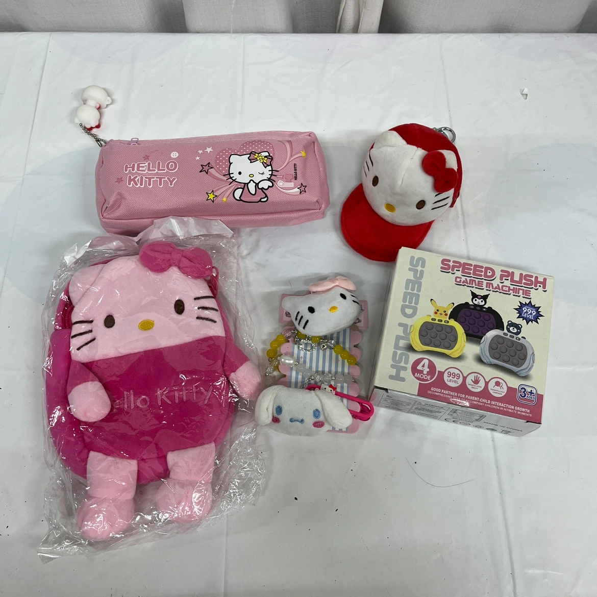 This lot includes a variety of Hello Kitty items such as a plush backpack, pencil case, hat change purse a pop it game, and other accessories. Christmas. Is just punters