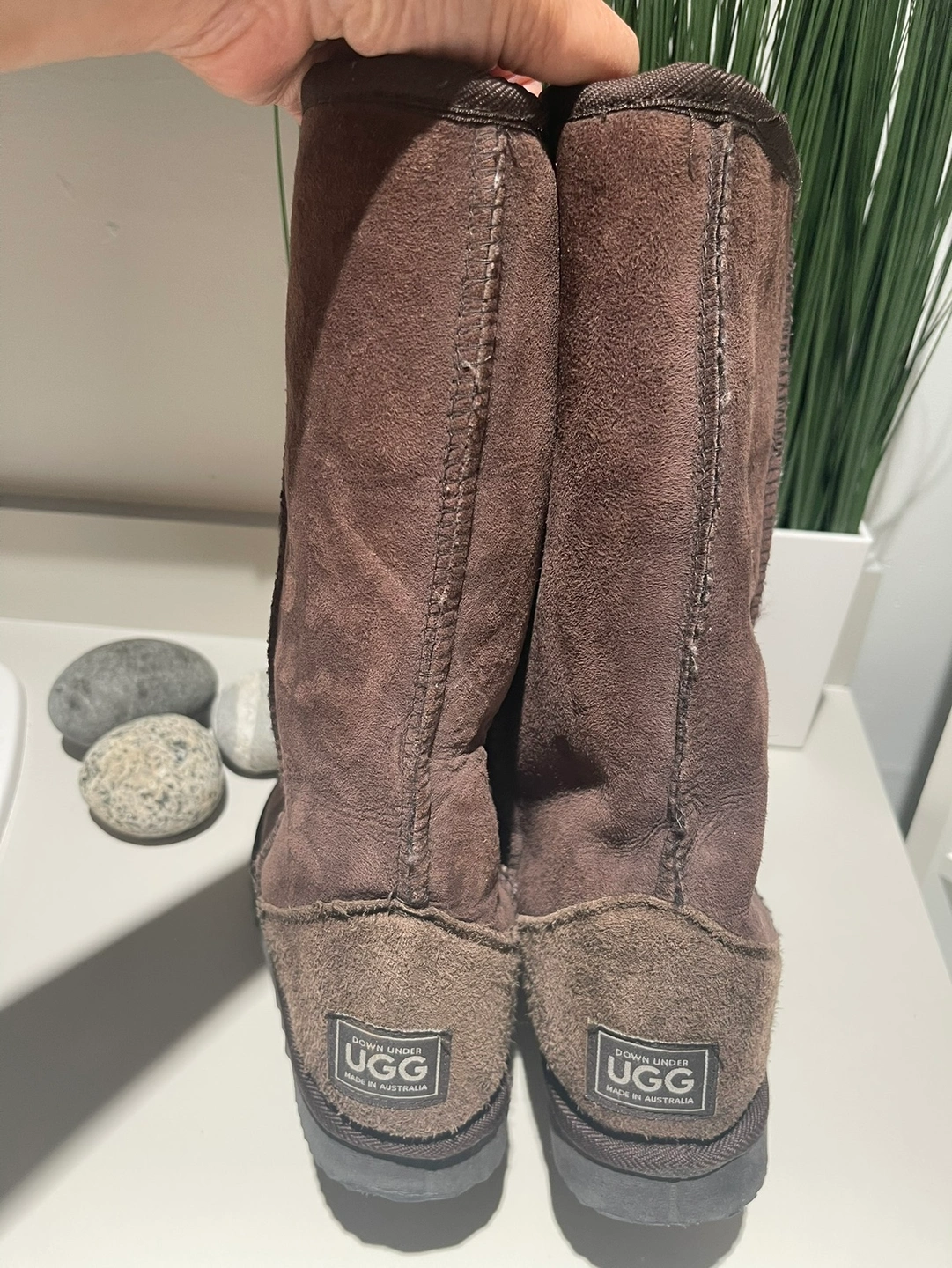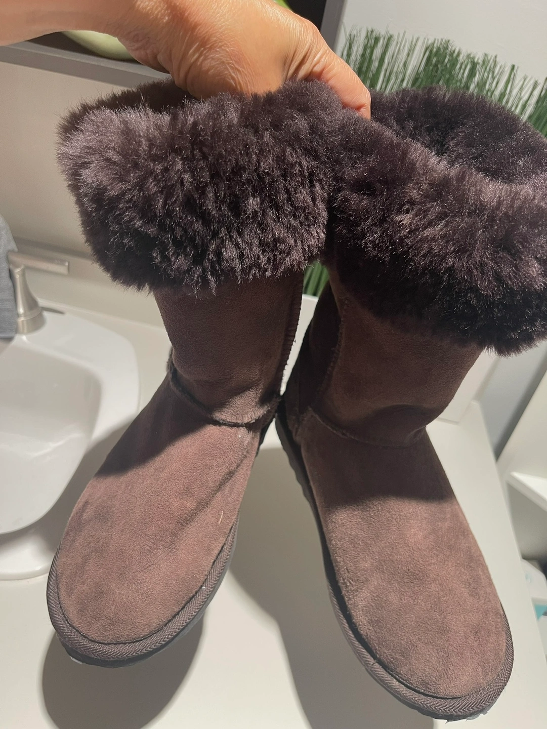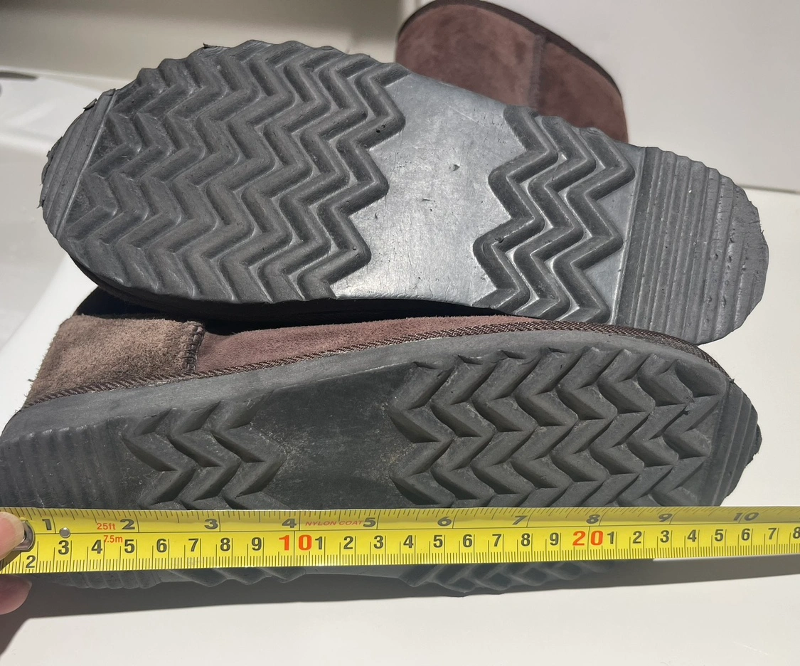 These are real tall UGG suede boots with full sheepskin lining and rubber sole. Lightly worn because daughter’s feet grew too fast. Size 6.