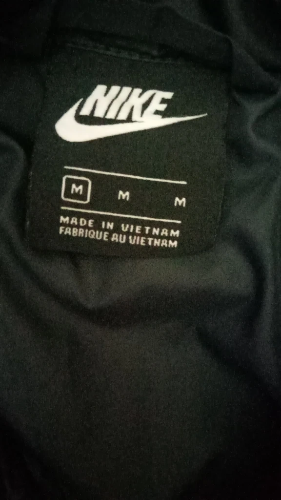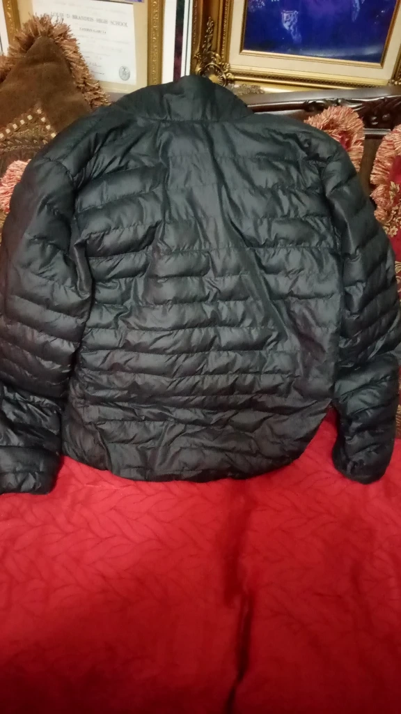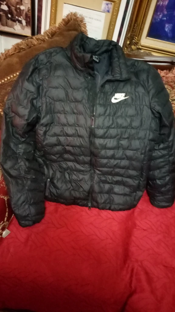 Black Nike puffer jacket, size medium, with a zipper closure and multiple pockets.