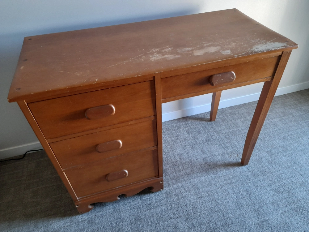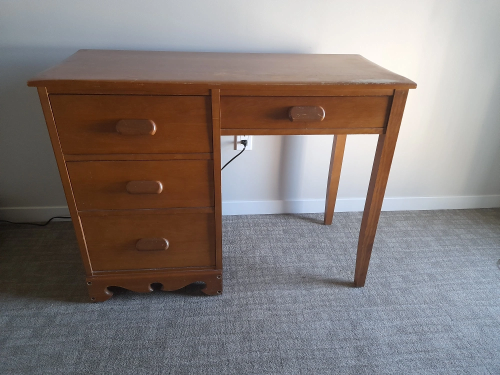 Solid wood desk with three drawers. It would be a great project to refinish and restore.