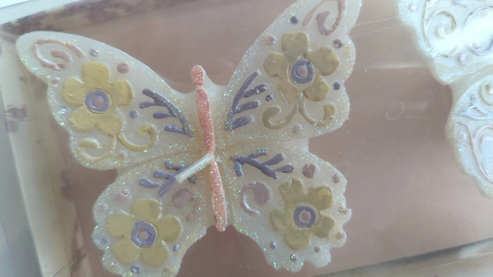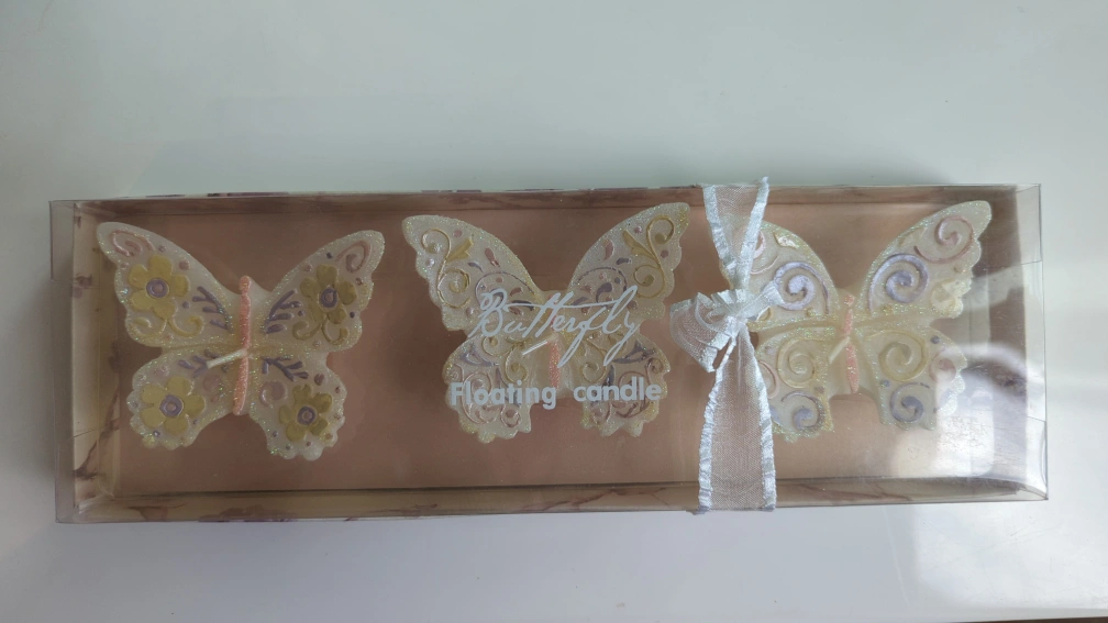 Three unopened floating candles in a clear box with a white ribbon. They are shaped like butterflies and decorated with glitter and swirling designs.