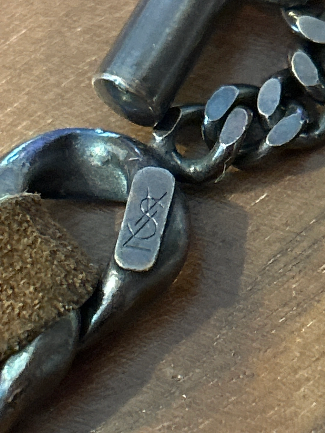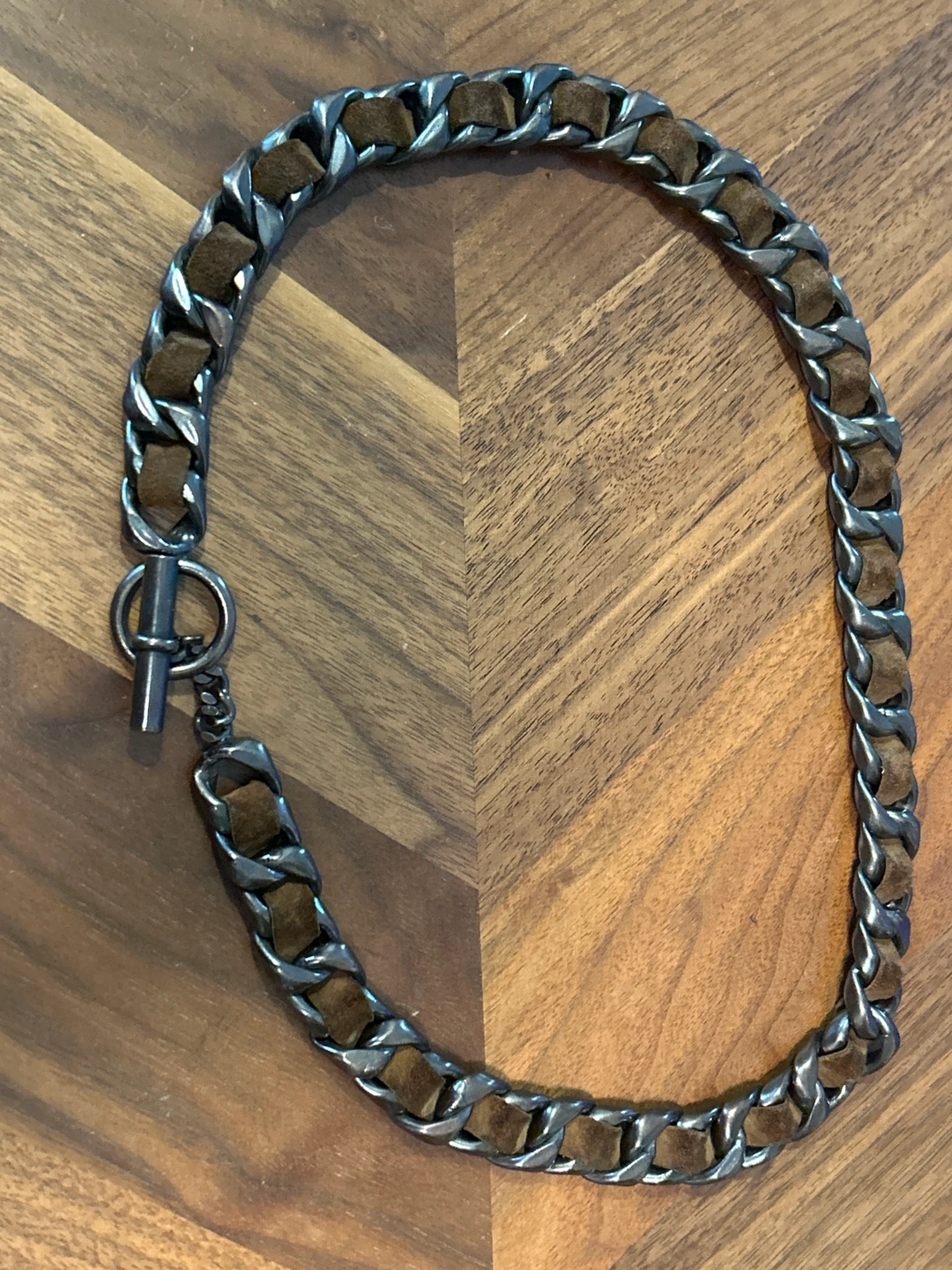 Suede and metal chain belt with a toggle clasp. This item fits designer small, could be worn as a very large necklace