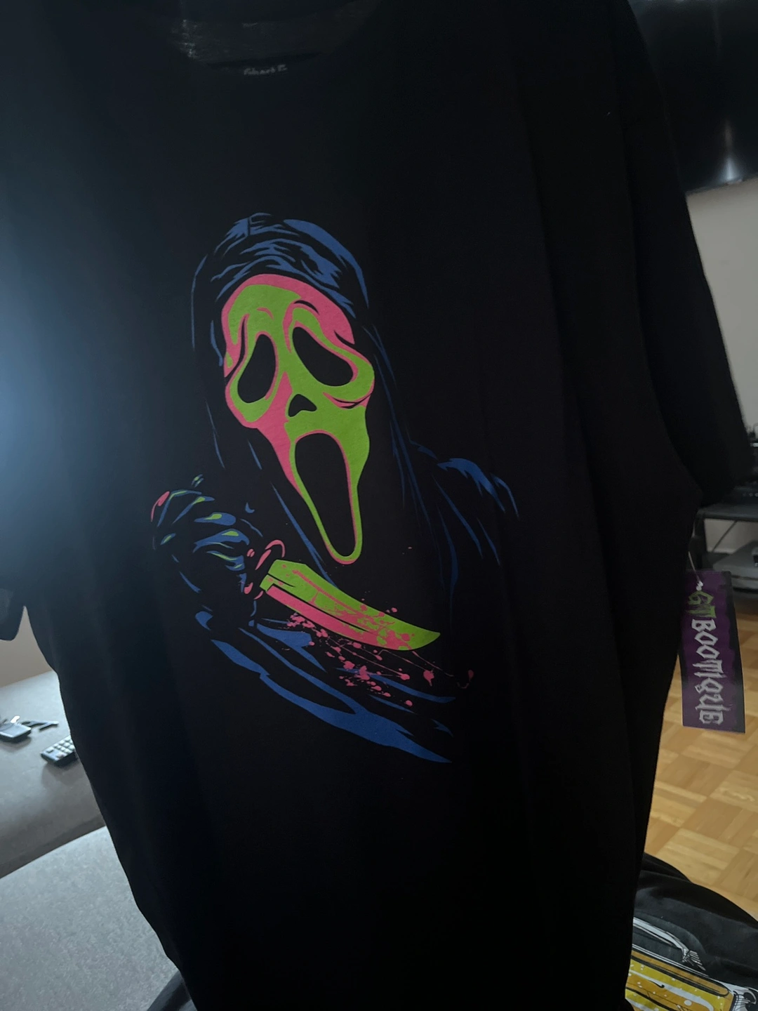 A black t-shirt with a neon green and pink Ghost Face design. It has a tag on the bottom that reads "The Icon of Halloween".