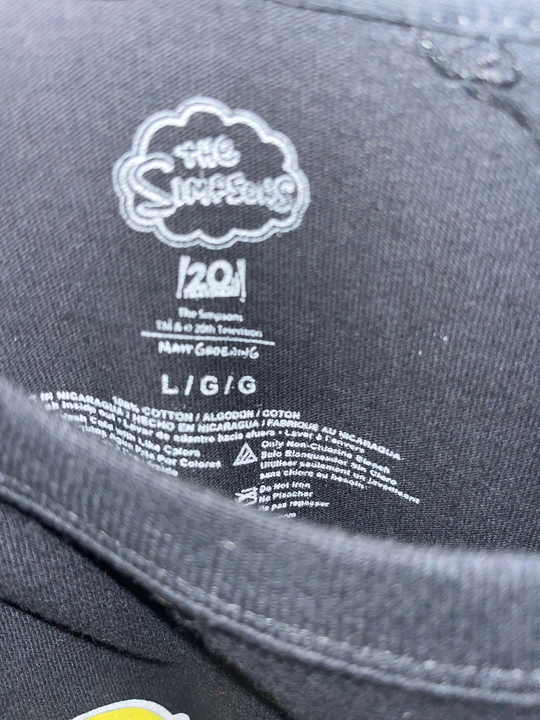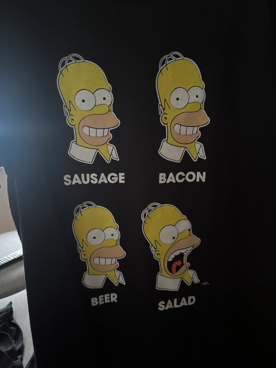 Black t-shirt with a graphic of Homer Simpson's face with the words "Sausage", "Bacon", "Beer", and "Salad" underneath.