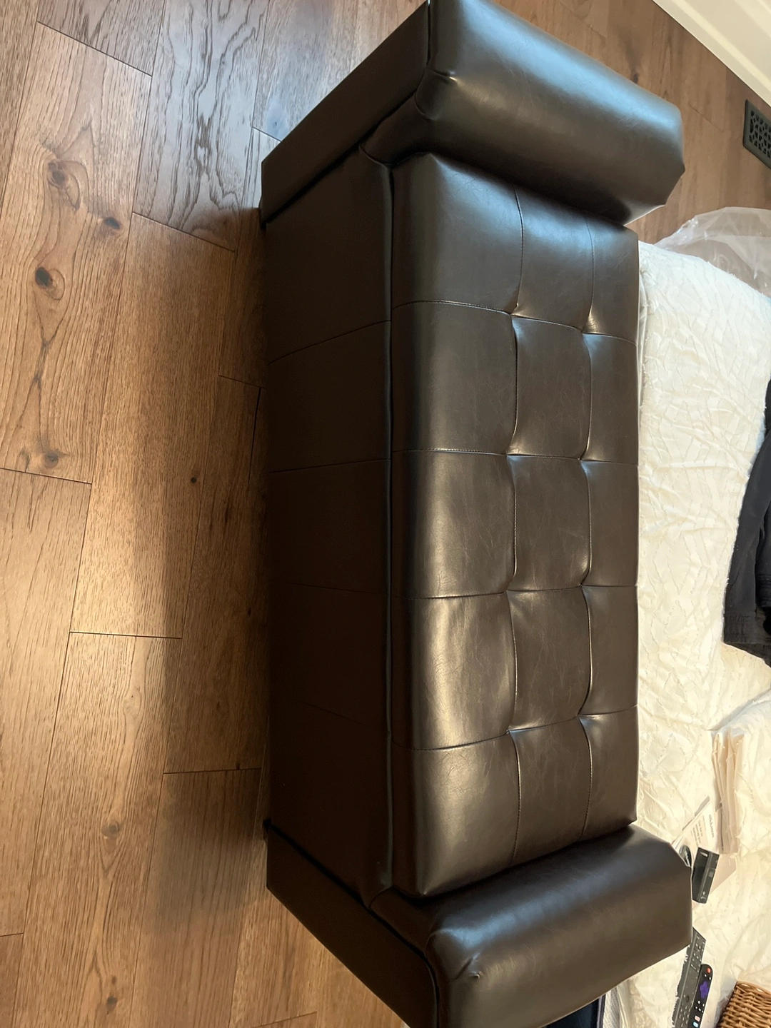 Brown storage ottoman with a lift-up top for storage. The ottoman is upholstered in faux leather with button tufting. It has arm rests and sits on short legs.