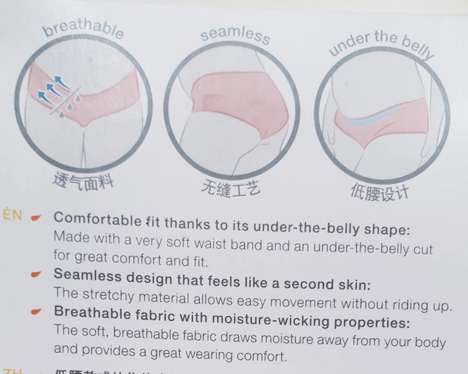 Seamless design with a second-skin feel. Comfortable fit thanks to its under-the-belly shape. Breathable and moisture-wicking fabric. One panty per package. New with Tags.