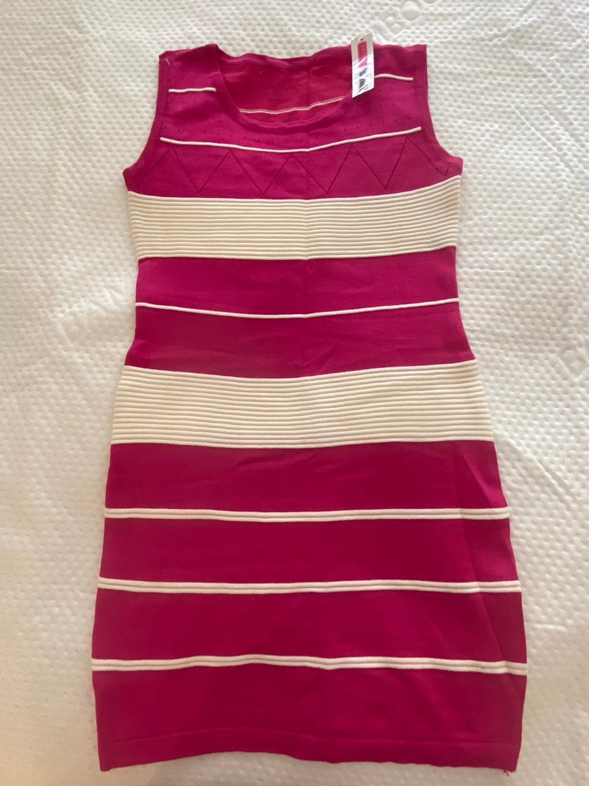 Sleeveless, pink and white striped dress with a round neckline. The fabric is a thin stretchy knit material. New with tag