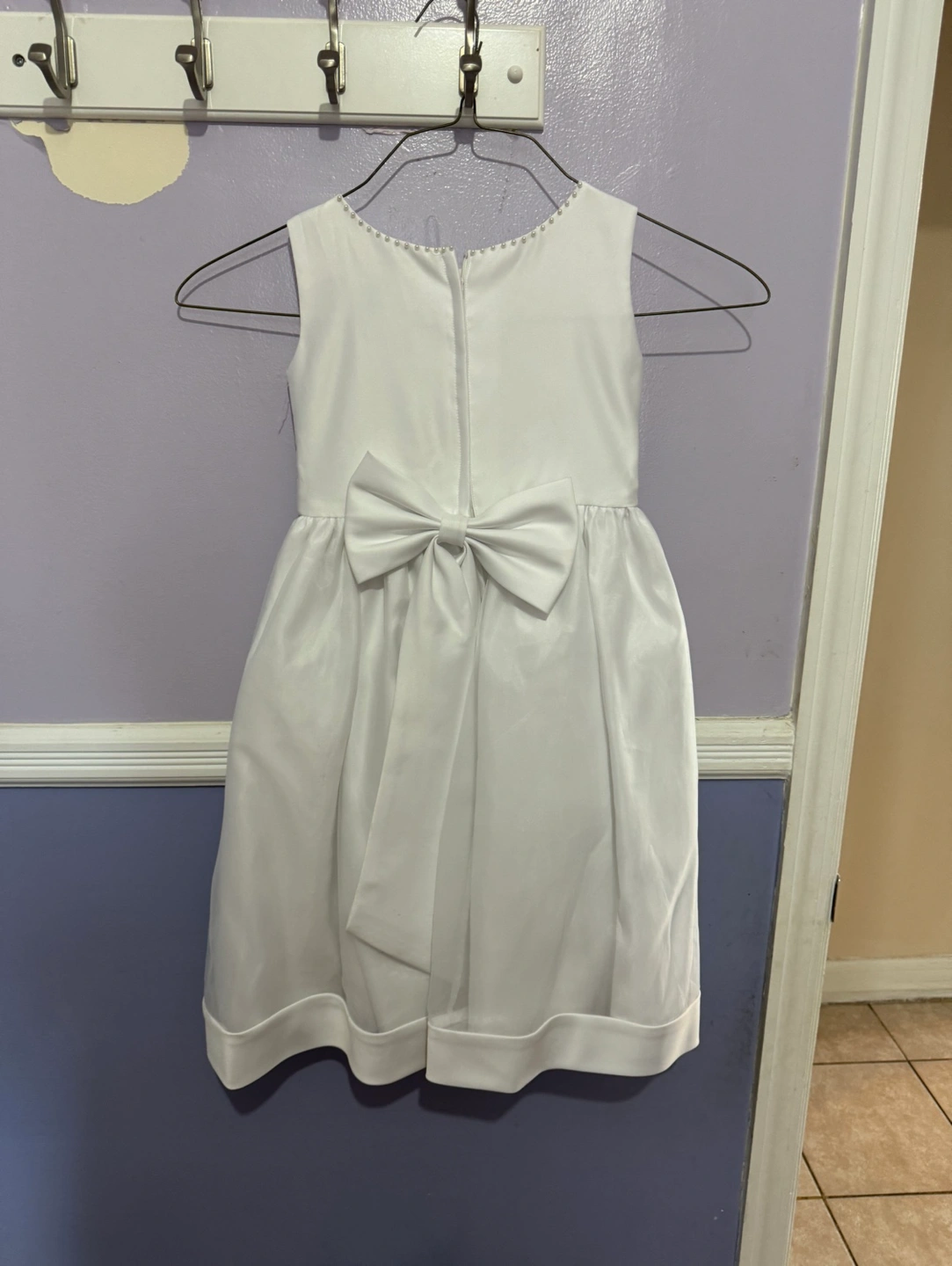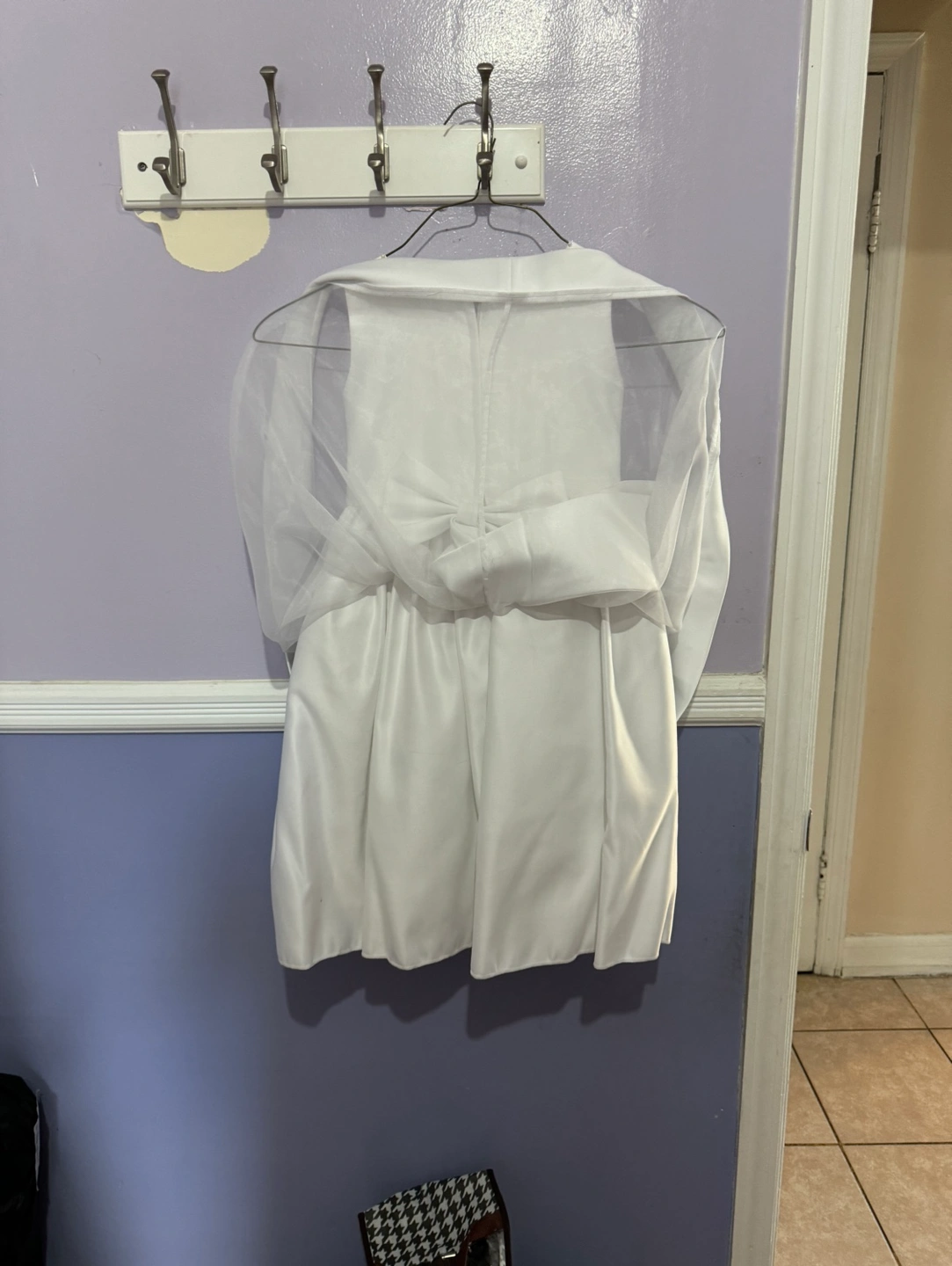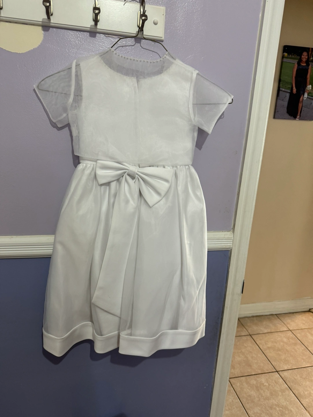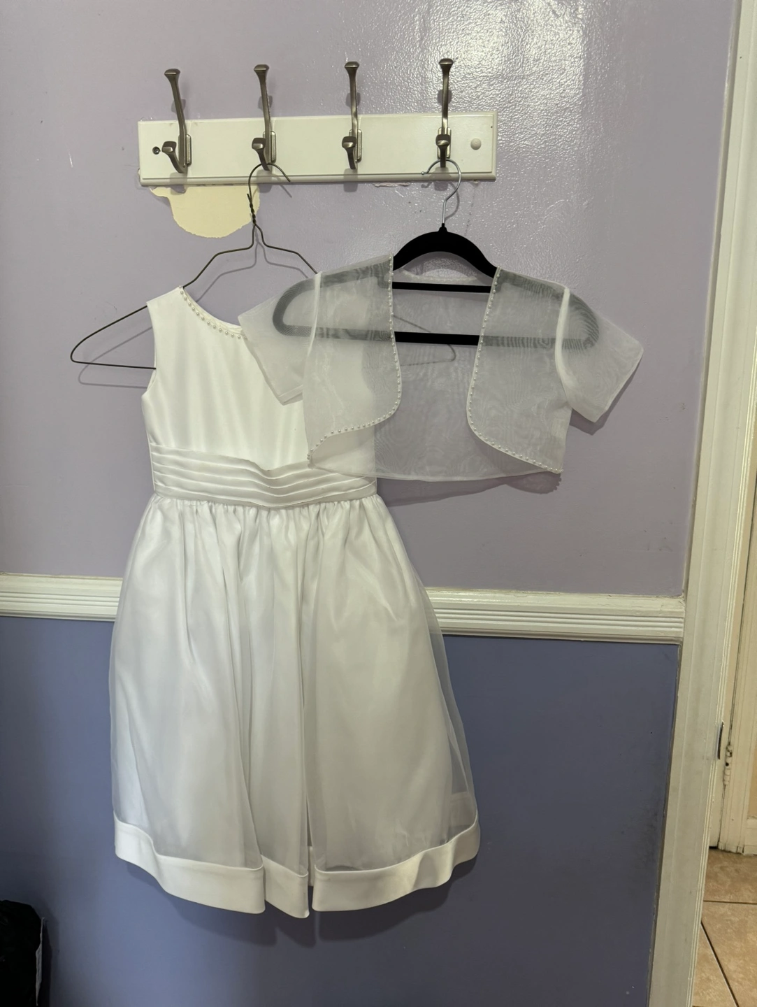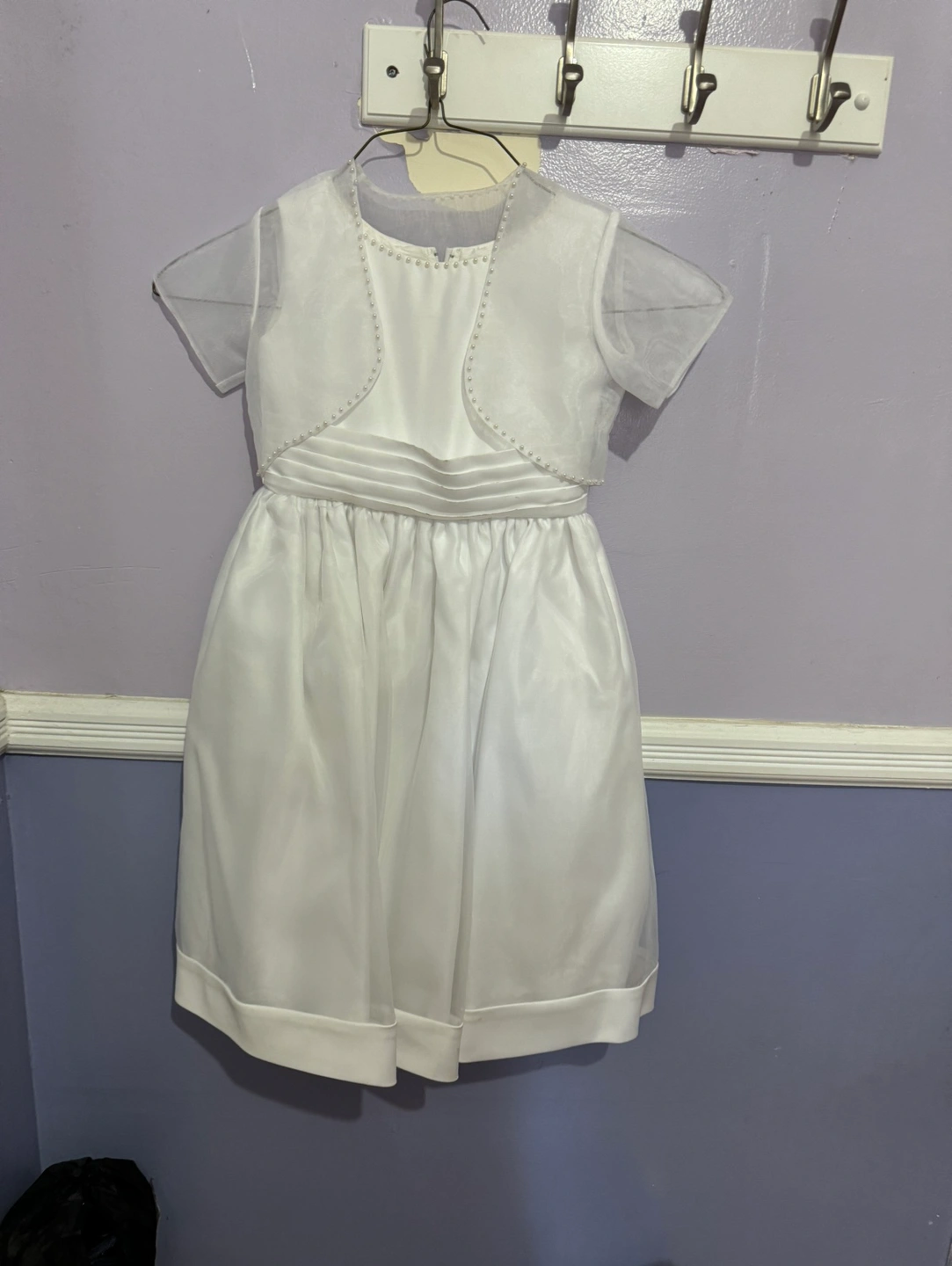 White flower girl dress with a matching bolero. The dress has a satin bodice with a tulle skirt and a satin bow in the back. The bolero is made of tulle with short sleeves. It could be used as communion dress or a baptism dress size 5 in girls.