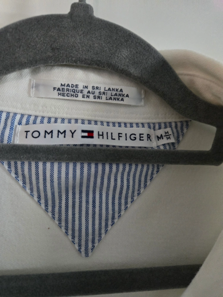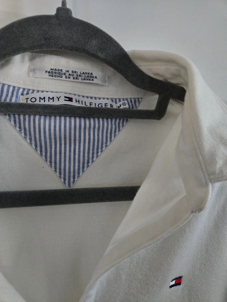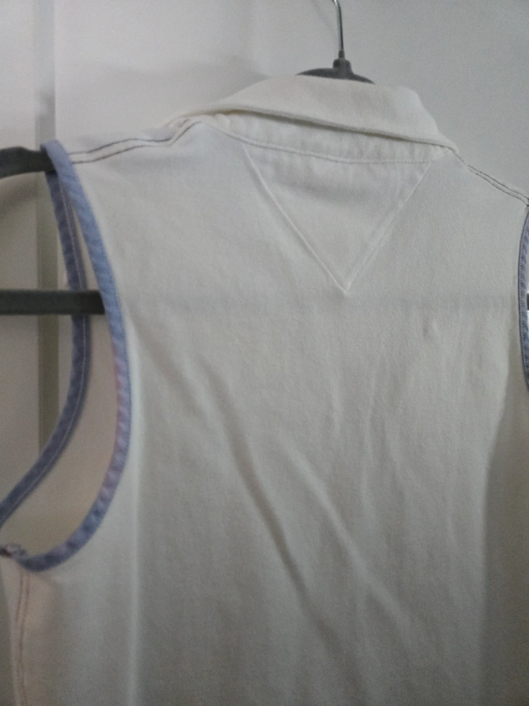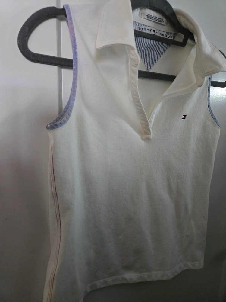White sleeveless polo shirt with a blue and white striped collar. Made in Sri Lanka. Size Medium. excellent condition.